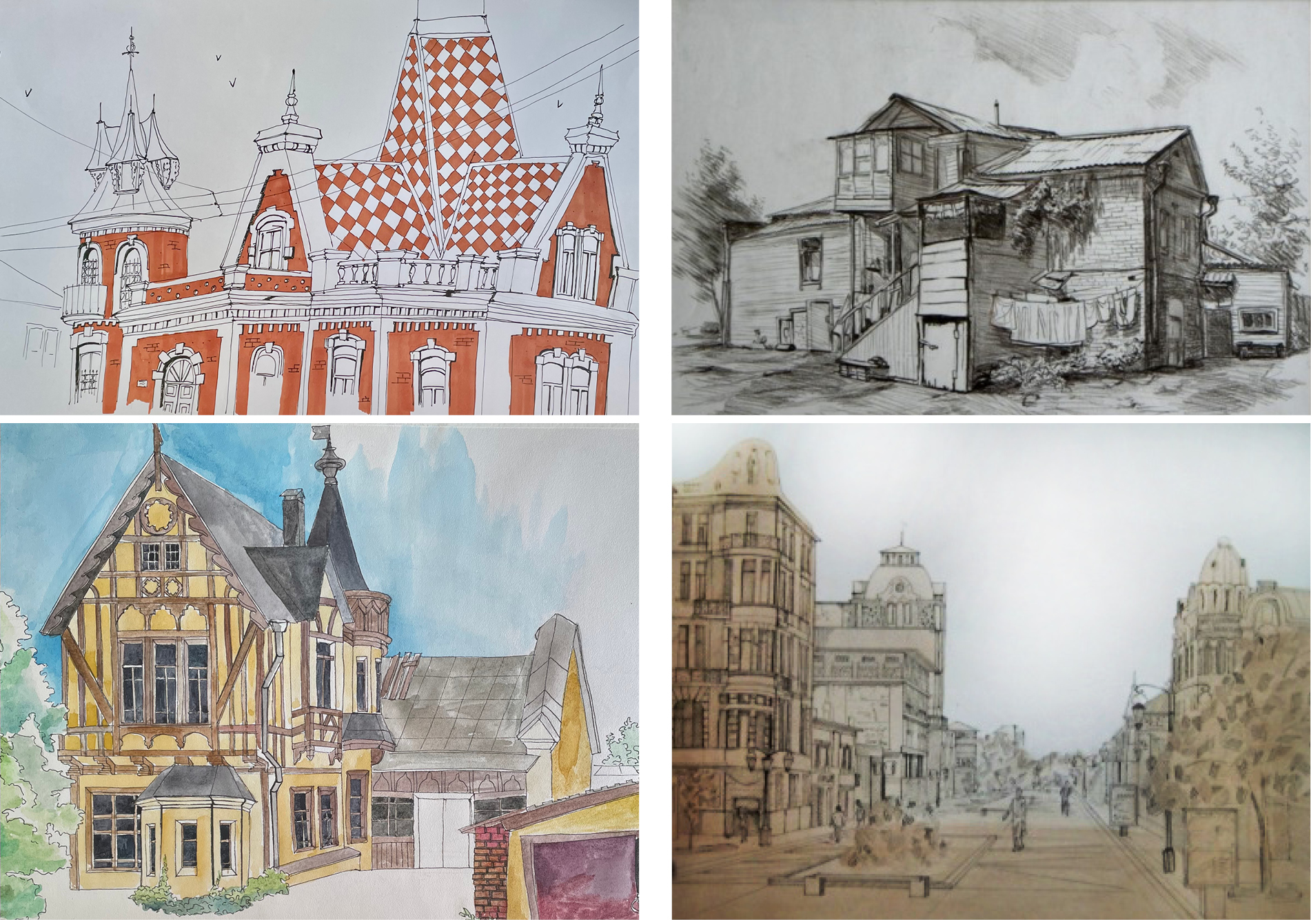 Образовательный процесс включает пленэрную практику как необходимую составляющую формирования профессиональных специалистов в области архитектуры и дизайна. Говоря о многолетней работе на кафедре рисунка, живописи и скульптуры Академии строительства и архитектуры СамГТУ в качестве педагогов рисунка и живописи, яркими моментами вспоминаются выездные пленэрные практики студентов. Начиная с 70-х годов прошлого века до 2019 года, студенты с руководителями пленэрной практики посетили многие города нашей страны. Студентам интересно было знакомиться с культурой других народов, обычаями и отличной от Самары пространственно-городской средой, которую ранее изучали на дисциплинах, связанных с историей искусств и архитектуры. Сегодняшняя пленэрная практика проводится в городе Самаре. На пленэре студентов интересует деревянное и каменное зодчество родного города. Интересными объектами для работы являются здания стиля модерн начала XX века, великолепно сохранившиеся в городе до наших дней (рис. 4‒6).