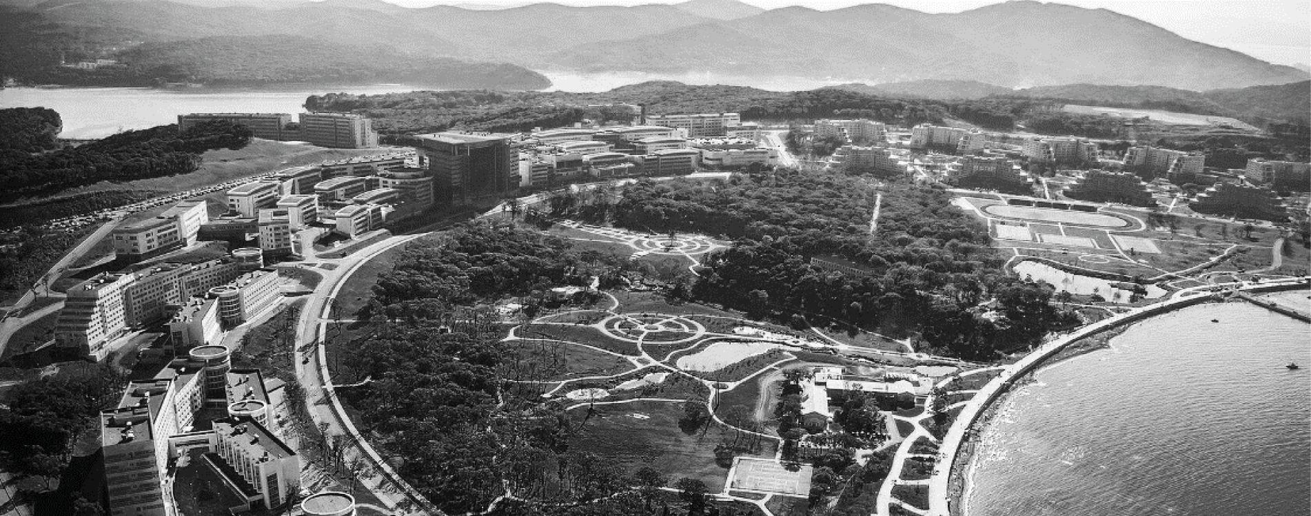 Периферийный подход предполагает размещение кампуса на территории с низкой плотностью застройки, часто на окраине города или за его пределами. Это позволяет создать пространство для образовательных и научных учреждений, не нарушая существующую городскую структуру, и интегрировать технопарк с возможностью дальнейшего роста и развития. При этом формируется чётко выделенная и обособленная территория с защищённым пространством, которая может иметь единый архитектурно-градостроительный облик с высоким качеством ландшафтной среды [8]. Однако такое размещение обладает рядом недостатков: отсутствие общей инфраструктуры с городом может отразиться в слабой синергии с местными жителями и рынком услуг; высокие издержки на строительство; зависимость от транспортной системы [9]. Например, межвузовский кампус Дальневосточного федерального университета, основанный на о. Русский, объединил четыре ведущих вуза и вмещает в себя 23 тыс. студентов (рис. 2). Такое слияние вузов на острове позволяет образовывать междисциплинарные связи при реализации технологически важных продуктов. Размещение подобного кампуса в условиях сложного рельефа Владивостока представляло бы сложную задачу. При этом необходимо отметить недостаток, который отмечают жители города: «отчуждение» кампуса привело к увеличению «возраста» населения. Фактически социально-активный слой населения исключен из жизни центра Владивостока [10].