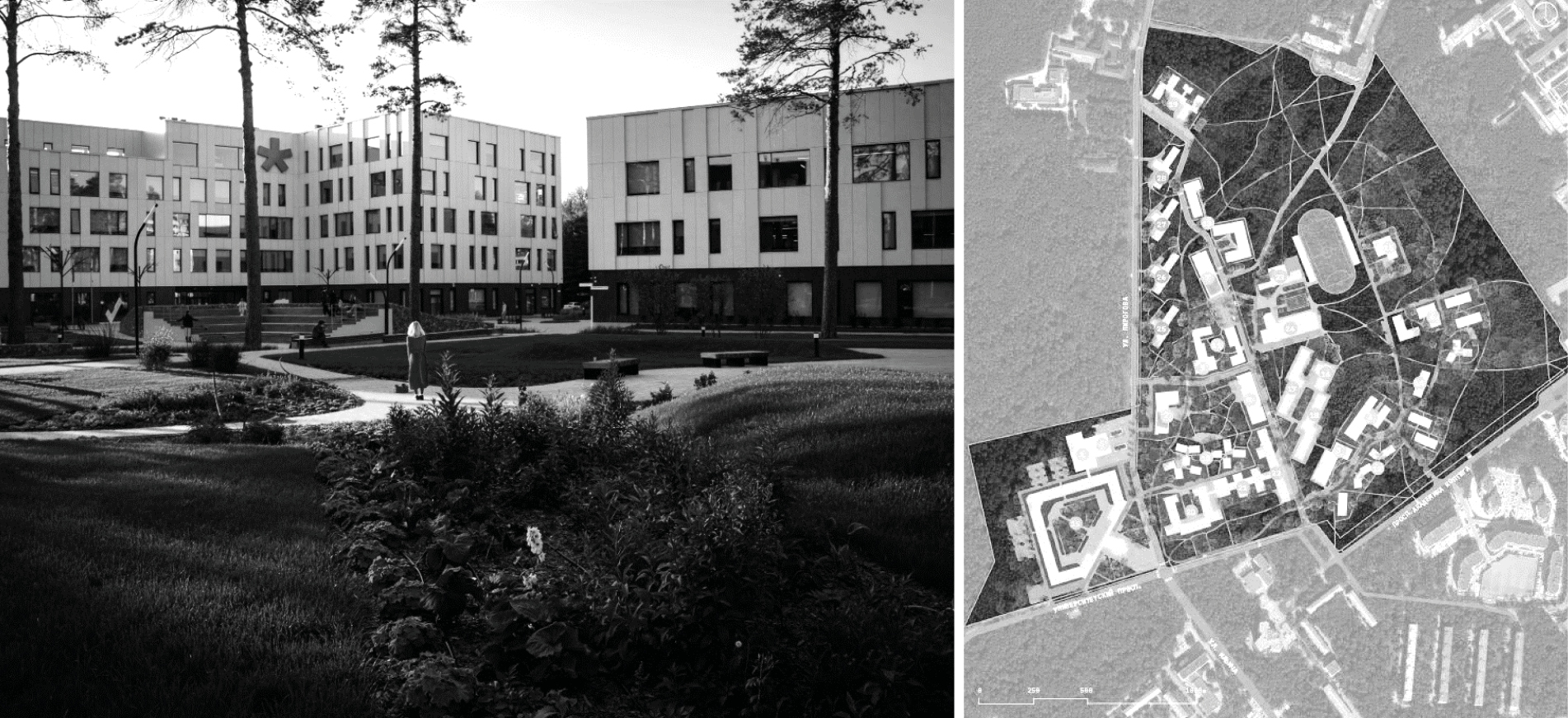 Локализованный подход подразумевает создание единой территории внутри города, на которой размещаются все необходимые университетские здания, и отличается некоторыми преимуществами, например единой концепцией (в том числе архитектурно-планировочной), сокращением времени перемещения (все находится в одном месте) и хорошим взаимодействием между вузом и технопарком для достижения потенциальных результатов. Однако такой тип сложно разместить в городе ввиду дефицита территорий и невозможности развития в своих границах [9]. Примером такого типа размещения стал кампус Новосибирского государственного университета (НГУ) в академгородке, который позволяет развиваться внутри собственных границ (рис. 3). Преимуществом в данном случае выступает улучшение существующей инфраструктуры вуза, создание новых проницаемых пространств и возможность использования рекреационного потенциала. Фактически кампус перезапустит потенциал академгородка и станет очагом его развития.