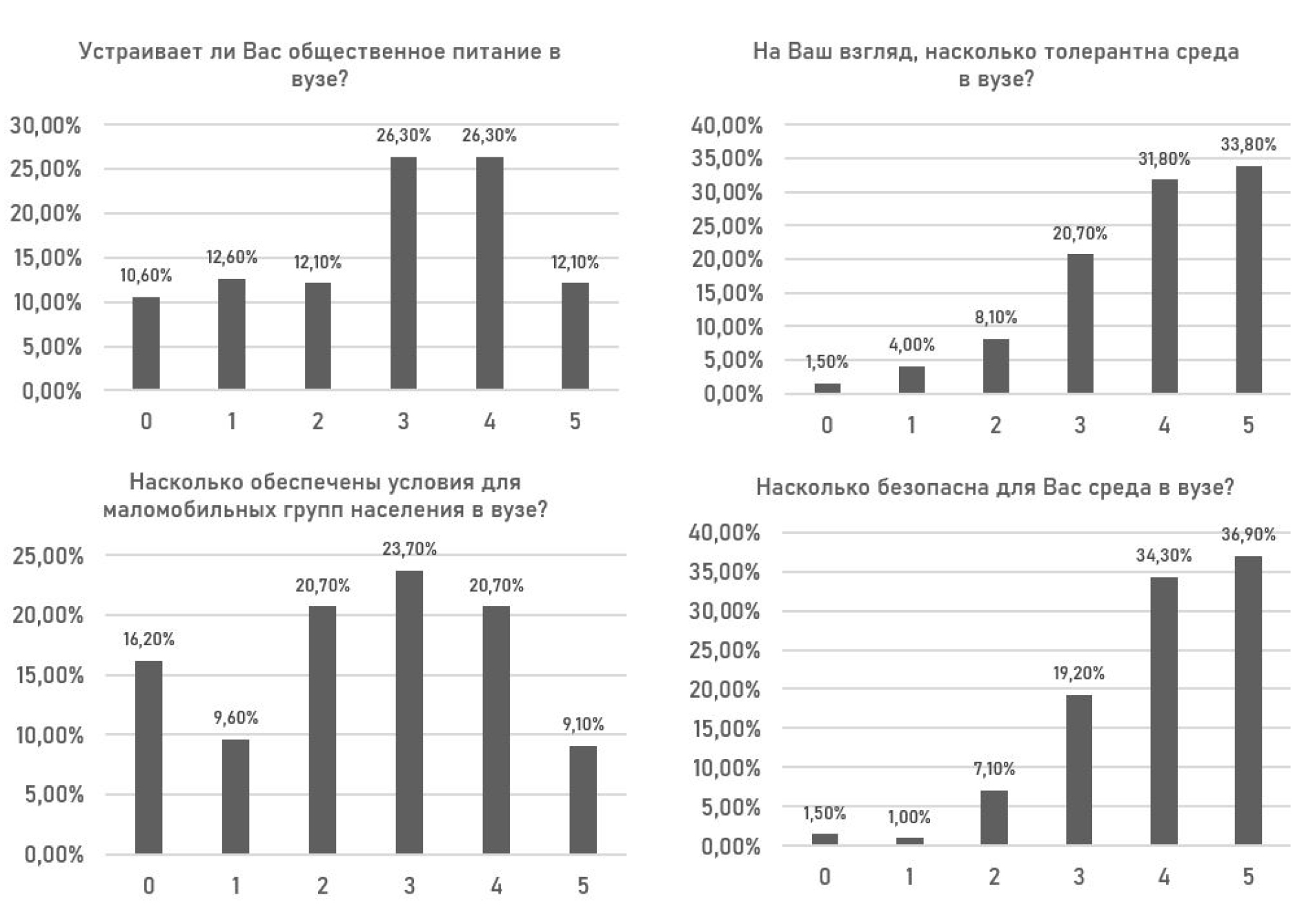 Также выделяются существующие проблемы. Общественное питание устраивает только 12,1 % респондентов. То есть качество услуг общественного питания не удовлетворяет 87,9 % респондентов. Поэтому стоит обратить внимание на необходимость развития инфраструктуры общественного питания в вузе. Важным аспектом является безопасная среда вуза, которая как положительная отразилась только у 36,9 % респондентов. Создание безопасной среды способствует формированию чувства защищённости и уверенности среди студентов и сотрудников, что является необходимым условием для эффективного обучения и работы. Также стоит обратить внимание на обеспечение безбарьерной среды на территории, которую положительно отметили только 9,1 % опрошенных. Это подчёркивает важность создания условий, которые будут доступны для людей с ограниченными возможностями здоровья, включая установку пандусов, лифтов и специальных парковочных мест. Обеспечение безбарьерной среды способствует созданию инклюзивного общества, где каждый человек имеет равные возможности для участия в жизни кампуса и реализации своего потенциала. Низкий уровень удовлетворённости качеством услуг общественного питания, недостаточная сформированность безопасной среды и ограниченный доступ к безбарьерной среде на территории вуза говорят о том, что необходимо провести комплексную оценку текущей ситуации и разработать стратегию улучшения условий жизни и обучения для всех категорий населения (рис. 7).