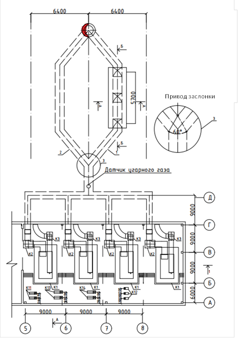 На рис. 1 приведена часть плана котельной [7] (котельные агрегаты с обвязкой газоходами к дымовой трубе) с установкой на втором участке газового тракта (дымосос – дымовая труба) установки по отбору газов. На рис. 2 показаны разрезы А-А и Б-Б газового тракта котла.