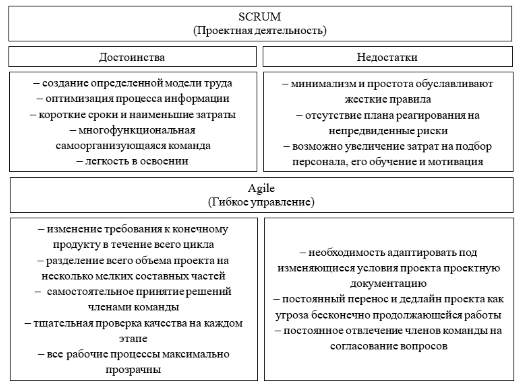 Еще одним методом управления бизнес-процессами в нестабильных условиях является Agile, основанный на принципах эффективного тимбилдинга (использование высококвалифицированных кадров с широким профилем предметных областей знаний). Для этого метода характерны также поэтапная цикличная работа и высокая вовлеченность потребителя в процесс создания конечного продукта. Рассмотрим достоинства и недостатки этих методов далее (рисунок 2).