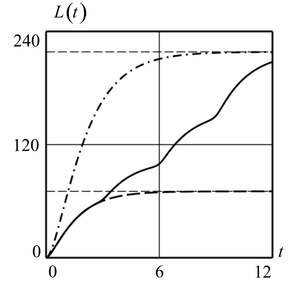 Fig. 6: Variants of graphs of functions of production volumes , constructed in accordance with numerical solutions of the Cauchy problem (20), (21) and the formula (18). The dashed line corresponds to the first option, the solid line corresponds to the second option, and the dashed line corresponds to the third option.