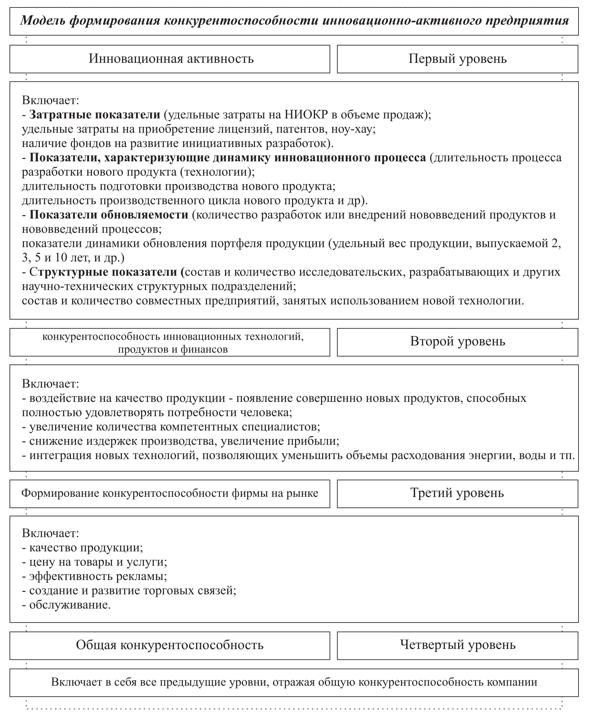 - первый – характеризует инновационную активность предприятия, отражая затратные, структурные, показатели обновляемости и динамики. Этот уровень является основой модели, иллюстрируя базовые характеристики конкурентоспособности;