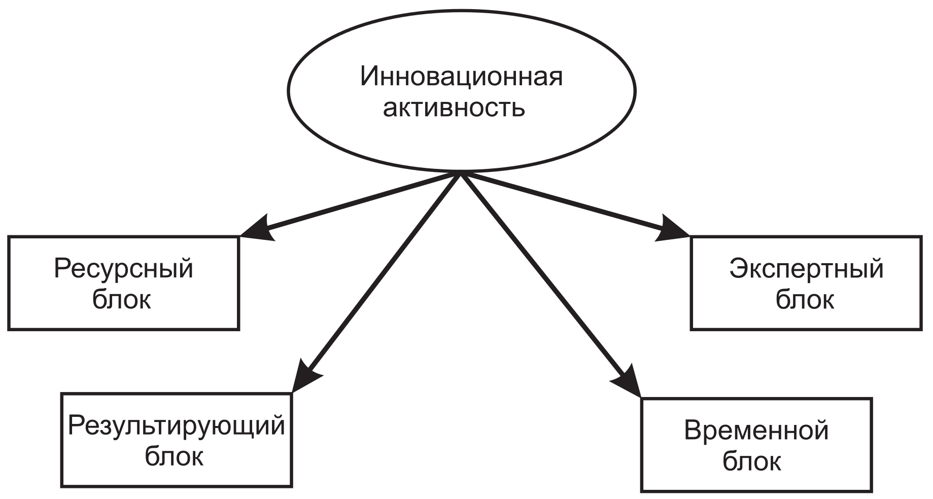 Для комплексного отражения содержания исследуемой категории инноватики, исходя из исследования многокомпонентного понятия инновационной активности и существующих подходов к оценке данной стратегической характеристики, предлагается методика оценки инновационной активности, включающая три блока: ресурсный, результативный, экспертный, временной.