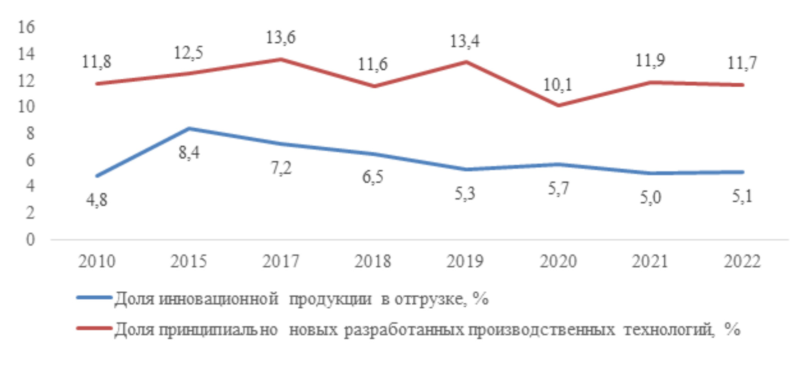 Одним из таковых показателей, отражающих технологическое развитие экономики, является уровень инновационной и научно-исследовательской деятельности. Так, доля инновационной продукции в объеме отгруженной продукции увеличилась с 4,8% в 2010 г. до 7,5% в 2017 г., однако на конец 2022 г. составляла 5,1%. Патентная активность также демонстрировала снижение в последние годы: количество патентов на изобретения сократилось со 151,4 единиц на 1 млн человек населения в 2010 г. до 117,5 единиц в 2020 г. и 102,5 единиц на 1 млн человек населения в 2022 г. Доля принципиально новых разработанных передовых производственных технологий в 2022 г. – 11,7%, находилась почти на уровне 2010 г. – 11,8%, при этом она была максимальной в 2017 г. – 13,6% (рис. 1).
