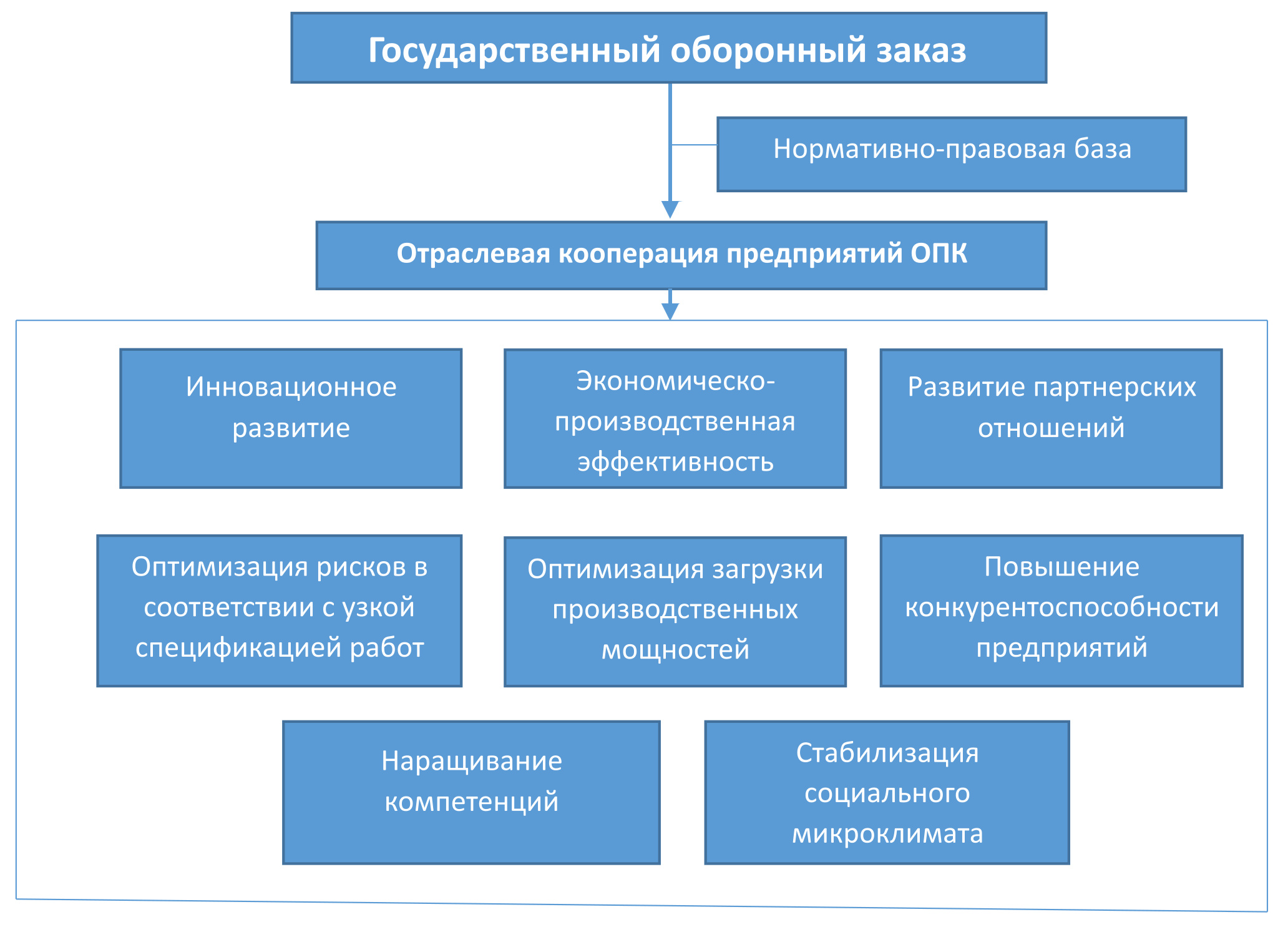 При выполнении ГОЗ отраслевая кооперация ОПК представляет собой налаженную структурную систему взаимодействия предприятий. Уровень ее стабильности и развития являются определяющими факторами при отнесении такой кооперации к ключевым и системообразующим инструментам обеспечения выполнения государственного заказа, предусматривающим инновационное, производственное, технико-технологическое, кадровое, экономическое и финансовое взаимодействие участвующих в кооперации организационно–правовых структур. Значимость каждого вида теоретического и практического отраслевого взаимодействия обеспечивает масштабный подход к планированию, управлению и выполнению целевых задач.