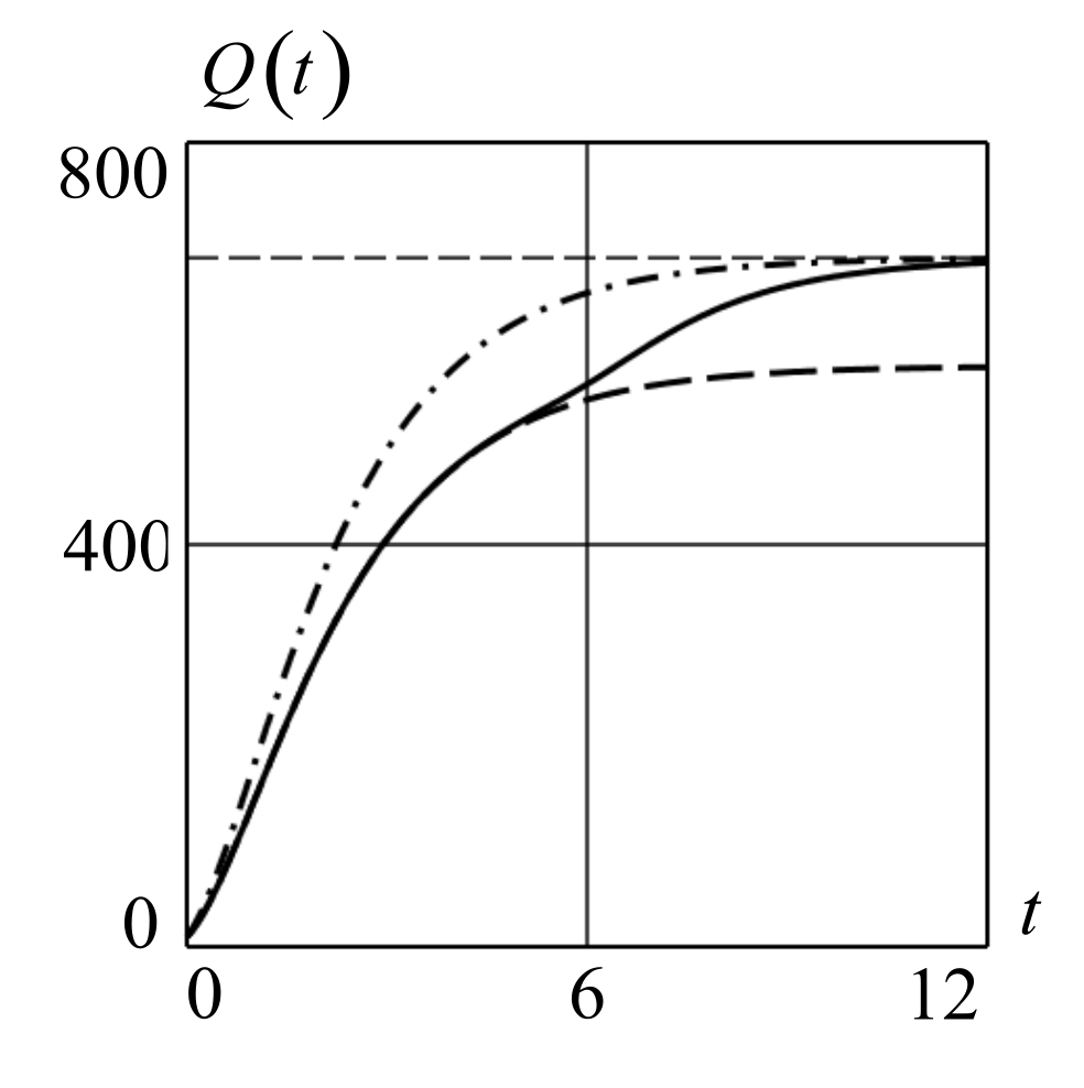 Fig. 3: Variants of growth curves of cost volumes , constructed based on the results of the numerical solution of the Cauchy problem (18) and formula (16). The dashed line corresponds to the first variant, the dashed – dotted line corresponds to the second variant, the solid line corresponds to the third variant.