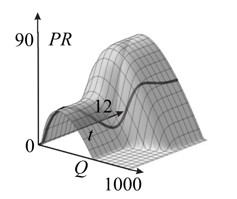 На рис. 6 представлена поверхность объемов прибыли предприятия , построенная по формуле (17), и пространственная кривая роста объемов прибыли предприятия