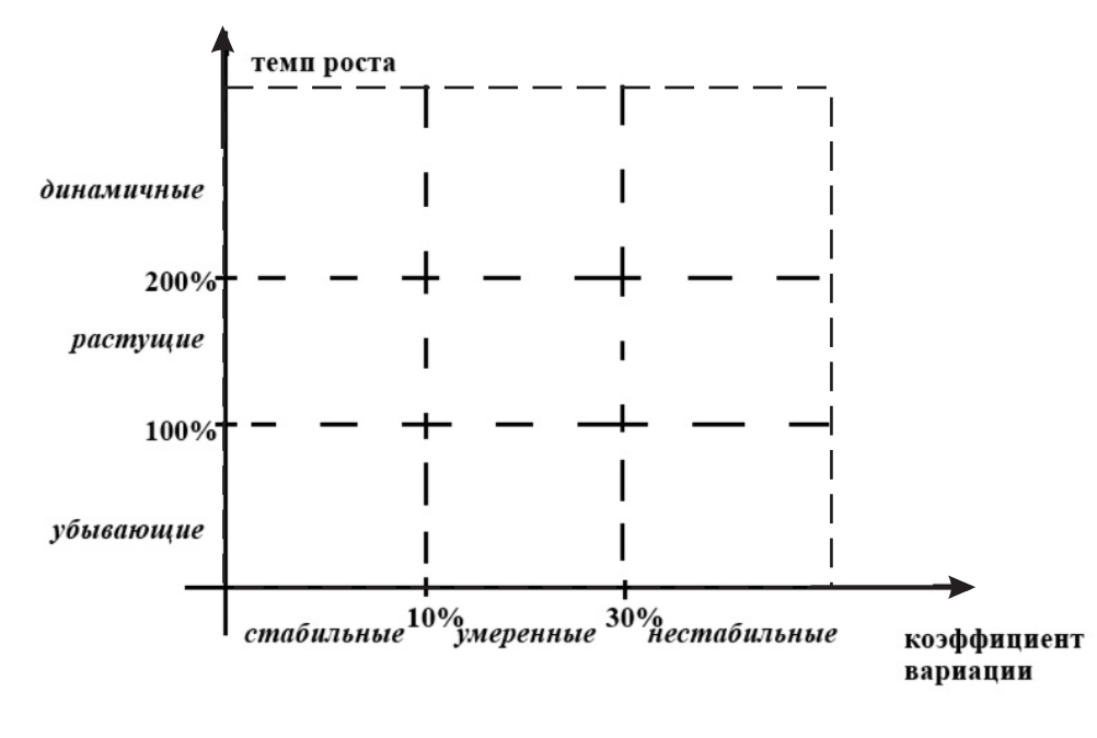 - Предложен метод классификации отраслей экономики на основании значений коэффициента вариации и темпов роста исследуемого показателя отрасли.
