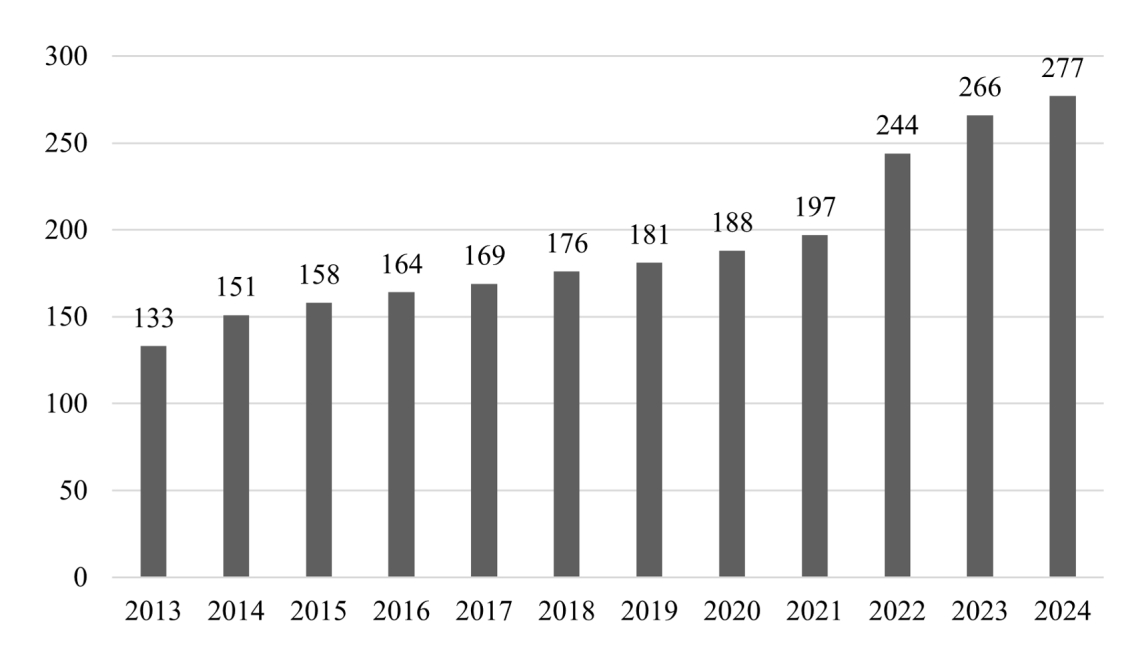 Публикация первых нефинансовых отчетов российских компаний появилась в начале 2000–х годов. Актуальность этого коммуникативного инструмента во взаимодействии с заинтересованными сторонами находит подтверждение статистикой численного роста компаний, которые ежегодно публикуют нефинансовую отчетность. Данные Российского союза промышленников и предпринимателей за 2013–2024 гг., приведенные на рис.1, отражают эту положительную динамику, состоящую в более чем двукратном увеличении количества компаний, публикующих нефинансовую отчетность [6 –7]. Сопоставимый тренд роста численности компаний, принимающих участие в подготовке публичной нефинансовой отчетности, отражен и в исследованиях Ассоциации менеджеров лучших практик КСО российского бизнеса.