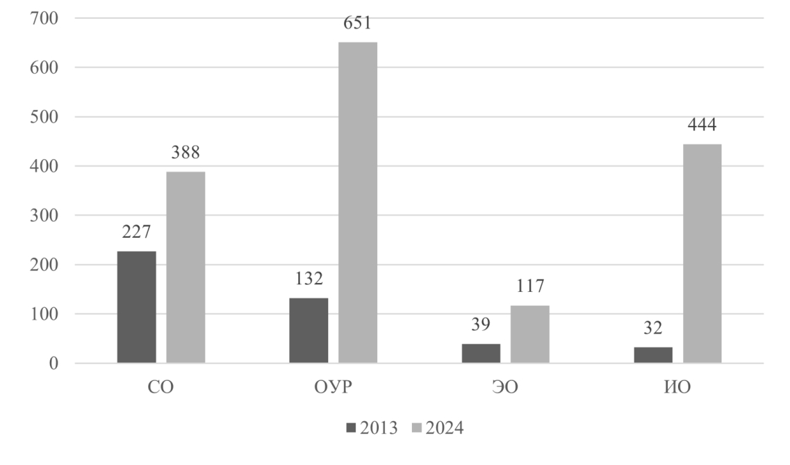 3. Fig. 2: Quantitative ratio of types of corporate non-financial reports in 2013 and in 2024. Compiled by the author based on data from the RUIE https://www.rspp.ru/