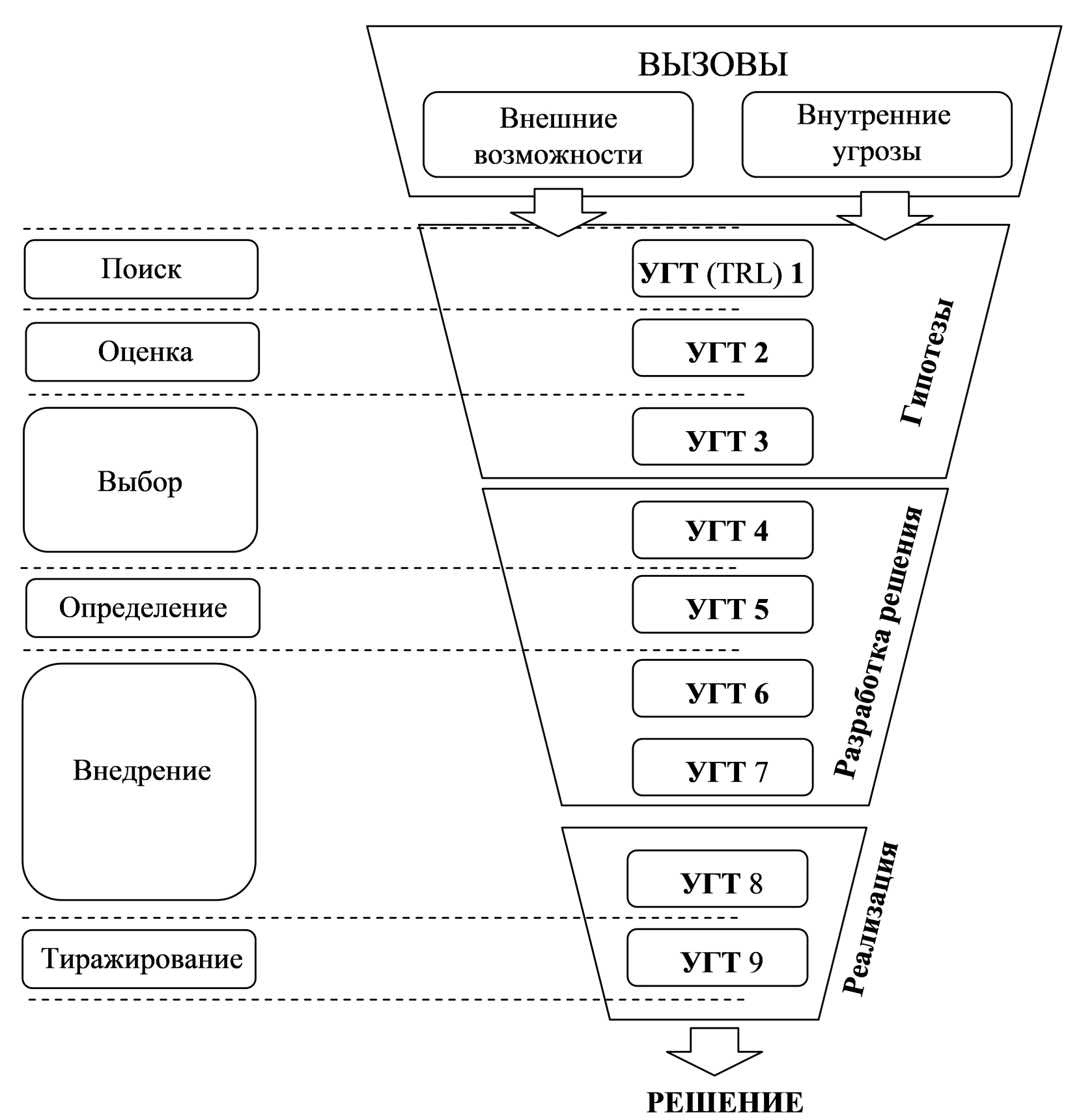 Методика оценки УГТ представляет собой структурированный подход к инновационному процессу, который разбивает его на девять уровней зрелости (рис. 1). Каждый уровень описывает конкретные требования к технологиям на протяжении всего ЖЦ, начиная от первоначальных исследований и заканчивая их полноценным внедрением. Для унифицированных технологий эта шкала учитывает не только их функциональные характеристики, но и степень интеграции с окружающей средой, повышая точность и достоверность принимаемых решений.