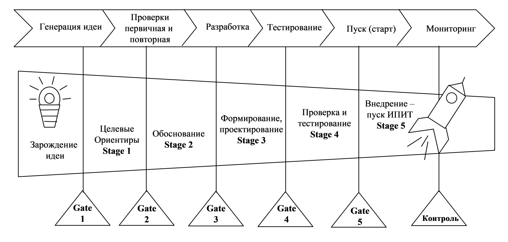 В границах концепции S-G новый продукт проходит через чётко определённое число этапов, как правило от четырех до шести, разделённых реперными (контрольными) точками или Gate — воротами. На этих ключевых моментах осуществляется тщательная оценка промежуточных достижений и результатов (рис. 2), что позволяет систематизировать процесс от генерации первоначальной идеи до успешного запуска готового продукта на рынок, обеспечивая тем самым повышение как эффективности, так и конечной успешности и результативности проектов ИПИТ в области инноваций.