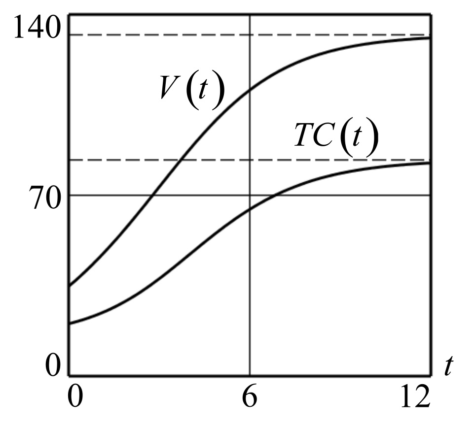 Рис.6: Графики кривых функции выпуска продукции V=V(t) и функции издержек TC=TC(t), полученные в результате численного решения задачи Коши (19), (20) и формул (11), (12). Расчетные значения: P=10; a=0.27; b=0.25; HK=0.25; HL=0.23; TFC=15; K0=0; L0=0, K∞=142.698; L∞=143.617; V∞=132.128; PR∞=48.421; λk=0.667; λk=0.5.