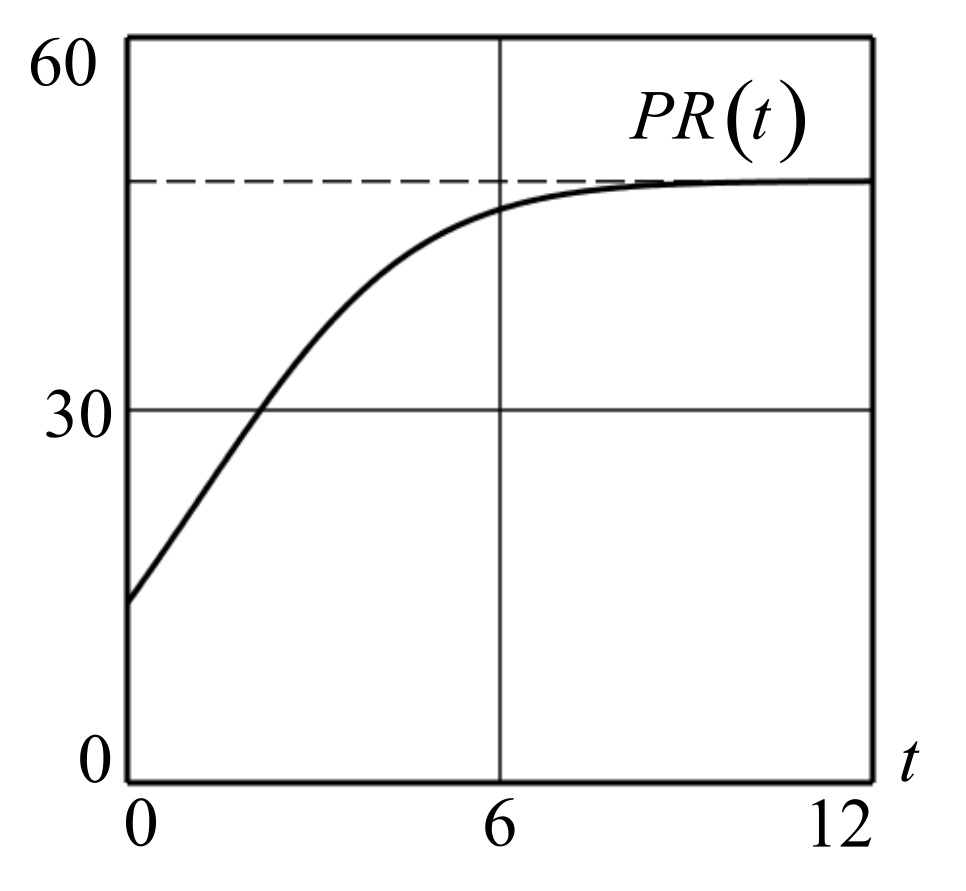 Рис.4: График кривой функции прибыли PR(t)=P*Qa(t)-H*Q(t)-TFC, полученный в результате численного решения задачи Коши (9), (10), для значения V∞≥Vmax. Расчетные значения: P=10; a=0.49; H=0.9; TFC=15; Q0=0; Q∞=27.736; V∞=50.944; PR∞=10.981, λ=0.667.