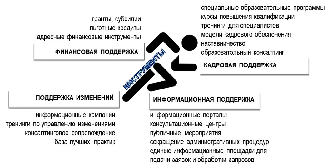 Благодаря этим мерам компаниям стало легче и быстрее взаимодействовать с государством и использовать доступные ресурсы для улучшения своей производительности и конкурентоспособности. Категории инструментов поддержки разного типа приведены на рис. 3.