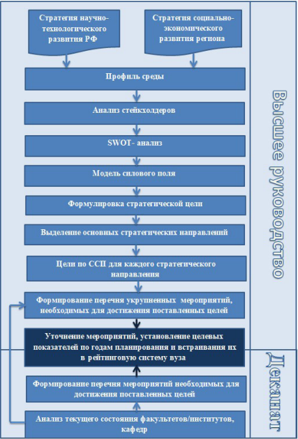 В данной статье описывается опыт совмещения этих двух подходов в ОмГТУ таким образом, что они компенсируют недостатки друг друга и укрепляют сильные аспекты. Все недостатки, присущие подходу «сверху-вниз», возможно компенсировать своевременным включением менеджеров среднего звена в процесс формирования стратегии. Таким образом, происходит вовлечение деканов факультета и заведующих кафедр к конкретизации мероприятий, направленных на достижение стратегических целей, что способствует реалистичным, достижимым и согласованным целевым показателям (рис. 1).
