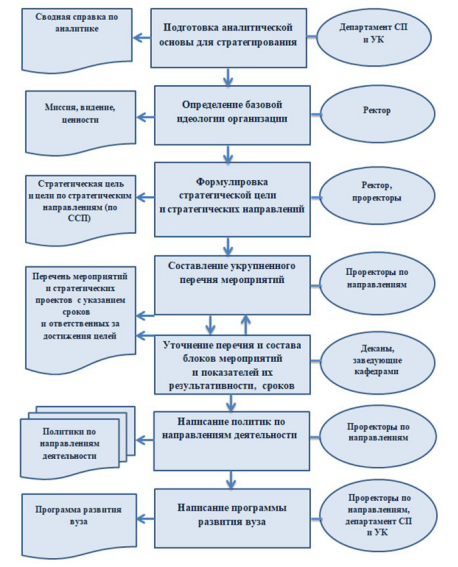 Следующей важной задачей является включение коллектива университета в разработку программы развития. Для решения данной задачи необходимо выбрать подход к стратегическому планированию, который позволял бы максимально включить коллектив вуза в разработку стратегии. Учитывая тот фактор, что все вузы имеют четкую вертикальную, иерархическую структуру, эта задача становится сложной в реализации и требует большой продуманности выбора того, какую категорию сотрудников и на каком этапе разработки подключать к стратегированию. Выбор этот лежит между существующими бизнес-подходами «сверху-вниз», «снизу-вверх» или выстраиванием комбинированного подхода [8].