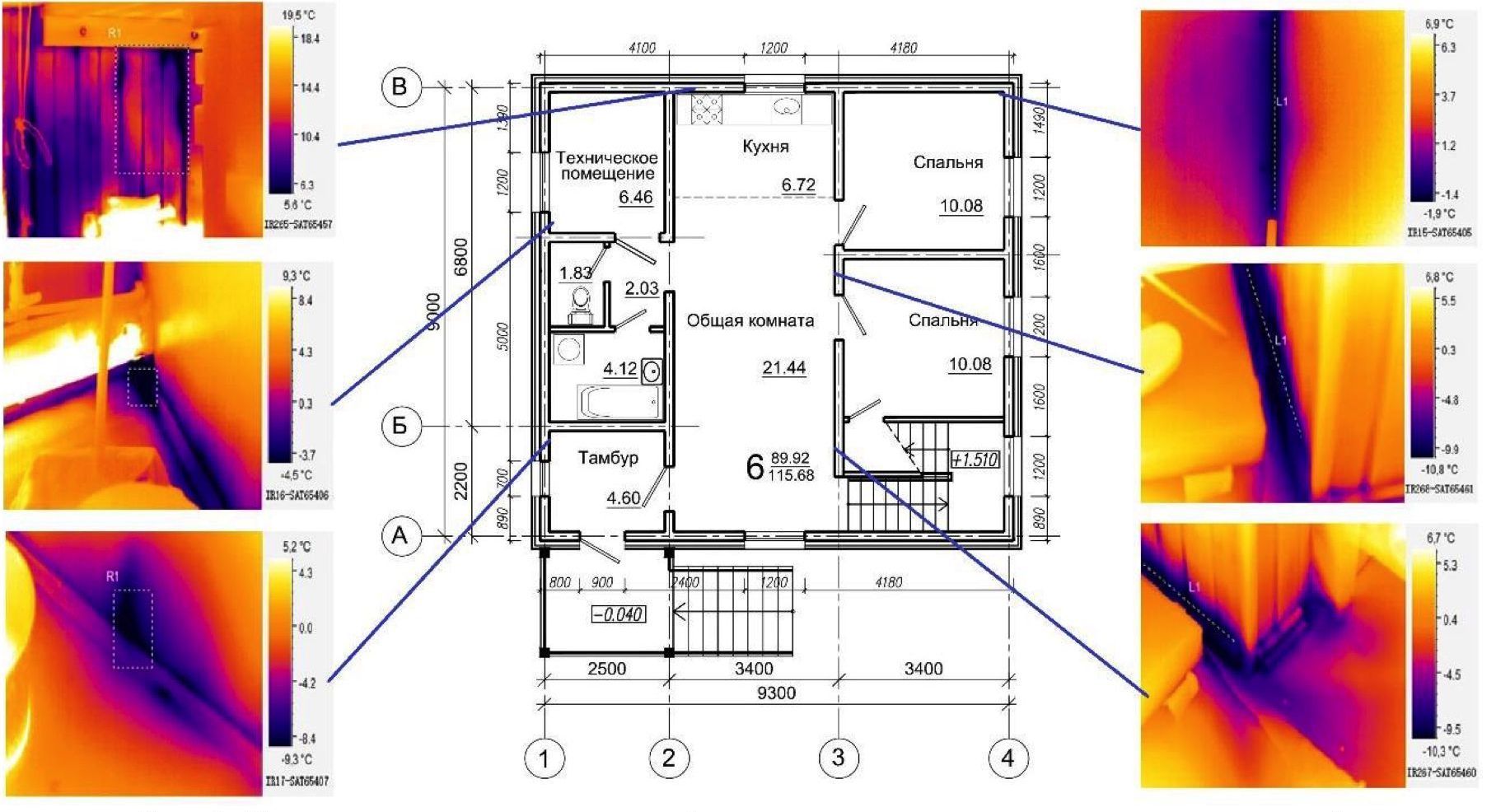 Fig. 2. Thermograms on the inner surface of the enclosing structures of a two-storey individual residential building with an area of 140 m2