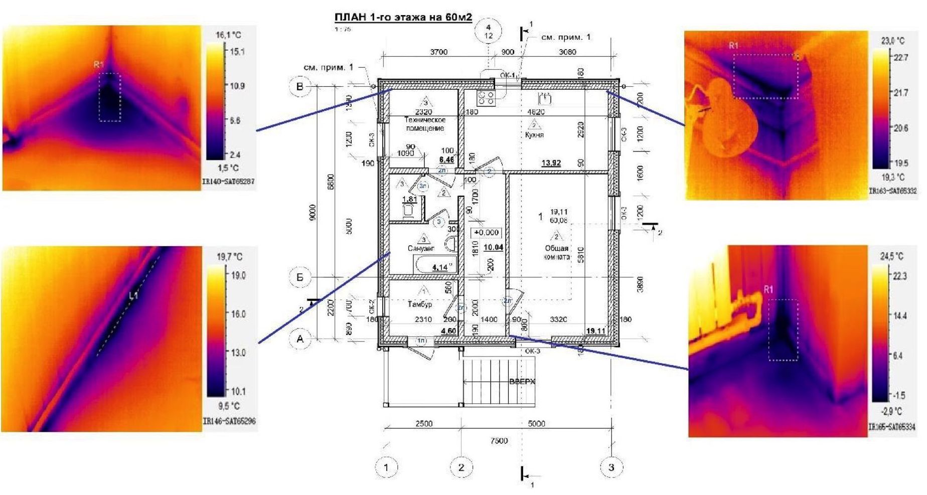 Рис. 3. Термограммы на внутренней поверхности ограждающих конструкций одноэтажного индивидуального жилого дома площадью 60 м2