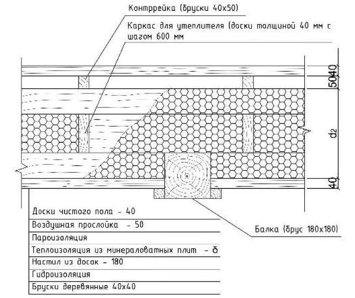 Первый вариант устройства цокольного перекрытия является традиционным и широко применяется в малоэтажном строительстве для различных вариантов объемно-планировочных и конструктивных решений домов. Один слой утеплителя укладывается между брусьями обвязки, дополнительный слой (слои) – между досками каркаса, связанными с шагом 590 мм для плотного прилегания. Сечение досок каркаса подбирается с учетом толщины утеплителя. В проектах часто принимают сечение балок из брусьев 180×180 мм.