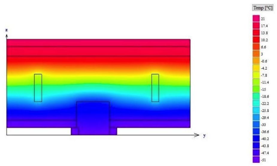 В узлах угловых соединений стен с покрытием средняя температура на поверхностях составляет 18,1…21,9 °С, что соответствует требованиям [11]. Значительные теплопотери в рассматриваемых домах наблюдаются на участке сопряжения внутренней стены с цокольным перекрытием, где минимальная температура достигает -6,7...-6,9 °С.