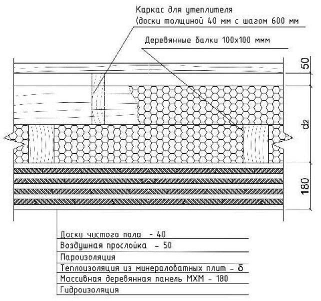 Второй вариант устройства цоколя для домов из МХМ-панелей связан с использованием самих панелей в качестве перекрытия вместо деревянных балок. Утепление при этом осуществляется за счет укладки минераловатных теплоизоляционных плит в один или два слоя между деревянными балками меньшего размера (100×150 или 100×100 мм) с дополнительным утеплением по каркасу из досок сечением 40×150 мм.