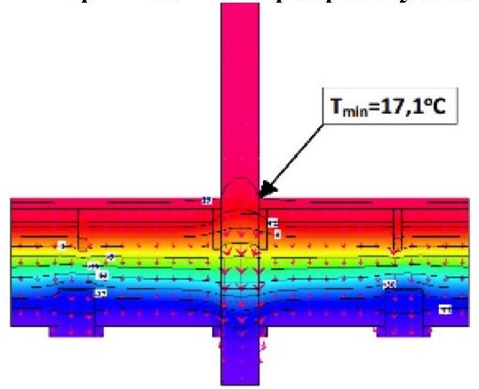 В типовых конструктивных решениях цокольного перекрытия по глади внутренней поверхности расчетные значения минимальной температуры не ниже 19,2 °С, что обеспечивает разницу между температурой внутреннего воздуха и температурой на внутренней поверхности в пределах нормируемых значений не более 3 °С по СП 50.1333.2012 [11]. Однако результаты теплотехнических расчетов 3D-моделей угловых участков сопряжения стен и цокольного перекрытия типового решения показали, что температура на внутренней поверхности рассматриваемого участка не только не отвечает вышеуказанным требованиям, но и значительно ниже температуры точки росы.