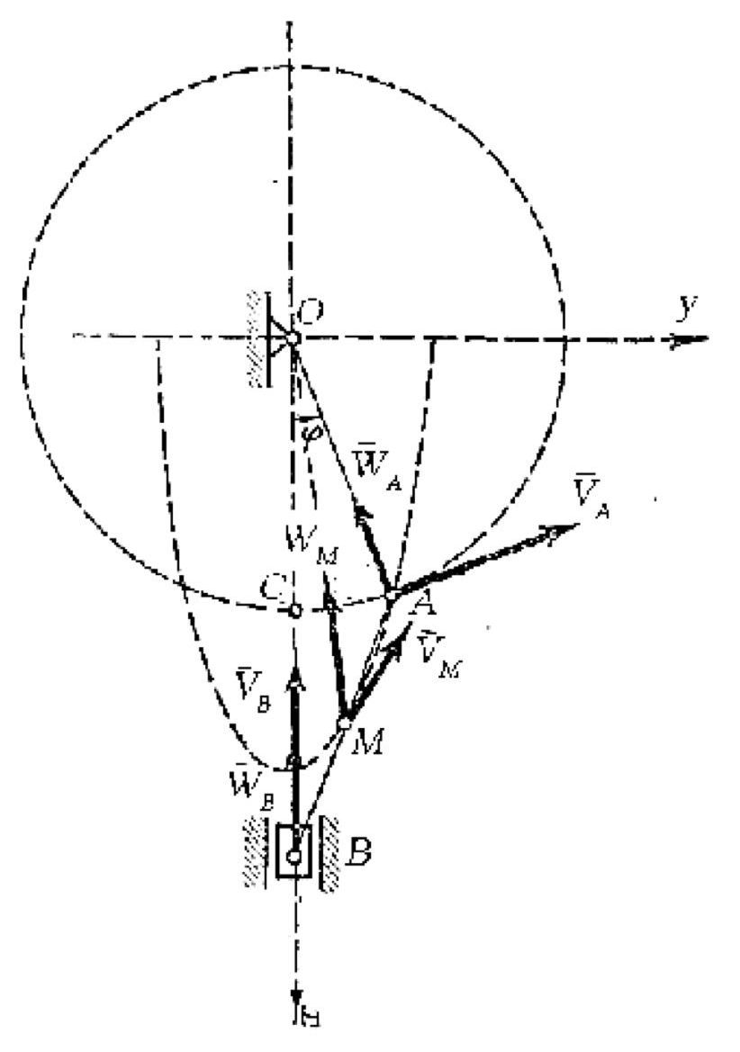 Определим траекторию, скорость и ускорение конца A кривошипа OA и середины М шатуна АВ, а также скорость и ускорение поршня В кривошипно-шатунного механизма (см. рисунок), если , а угол при вращении кривошипа растет пропорционально времени: , где и .