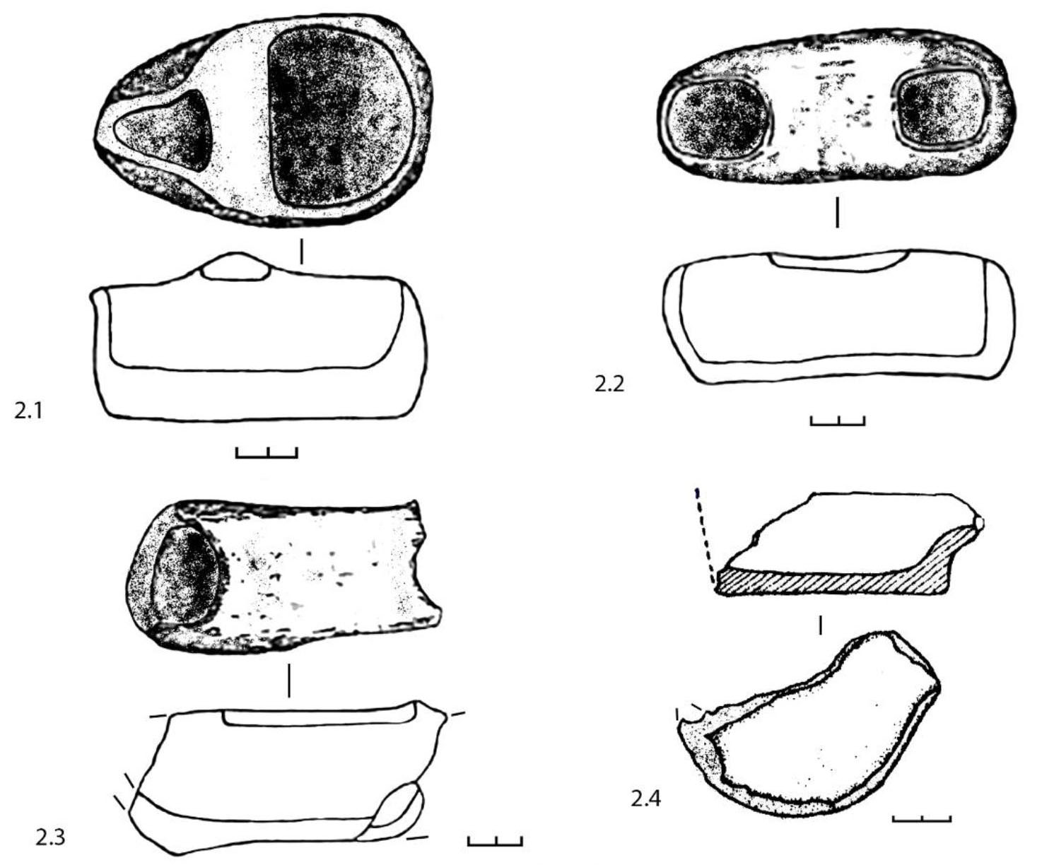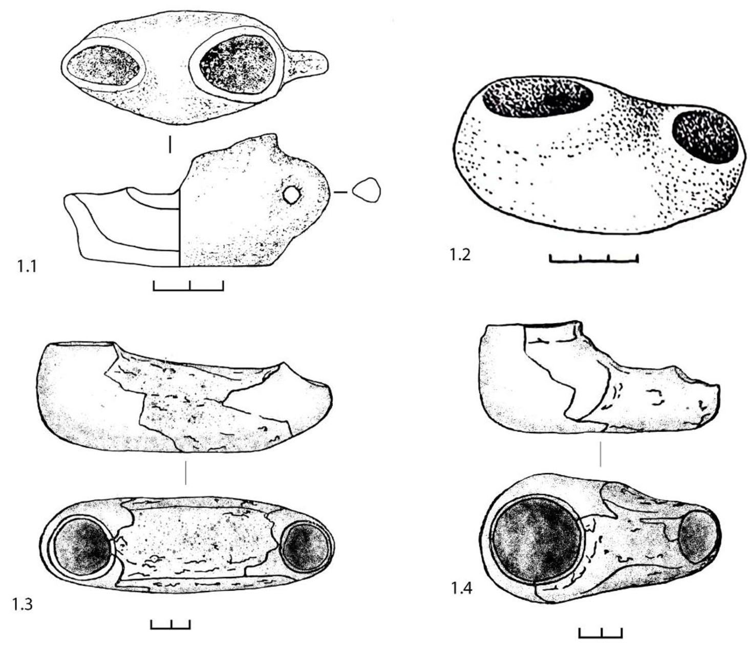 В одном из ниже залегающих слоев, датируемом амфорным материалом второй половиной I в. н.э., был обнаружен трехсекционный, вылепленный из глины предмет (Рис. 4.2). На поверхности сохранились следы нагара. В.П. Копылов предположительно обозначил его как светильник. Аналогий данному предмету нам не известно [Копылов 1999: 12–13, рис. 61].