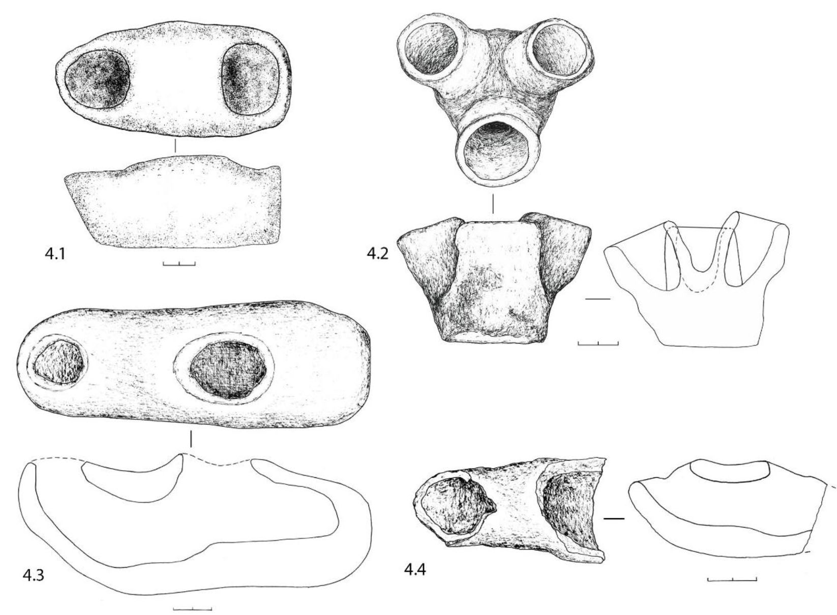 Рис. 4. Лепные светильники. 4.1–2 – Сухо-Чалтырское городище; 4.3–4 – Нижне-Гниловское городище. Рисунки Белецкой И.В.