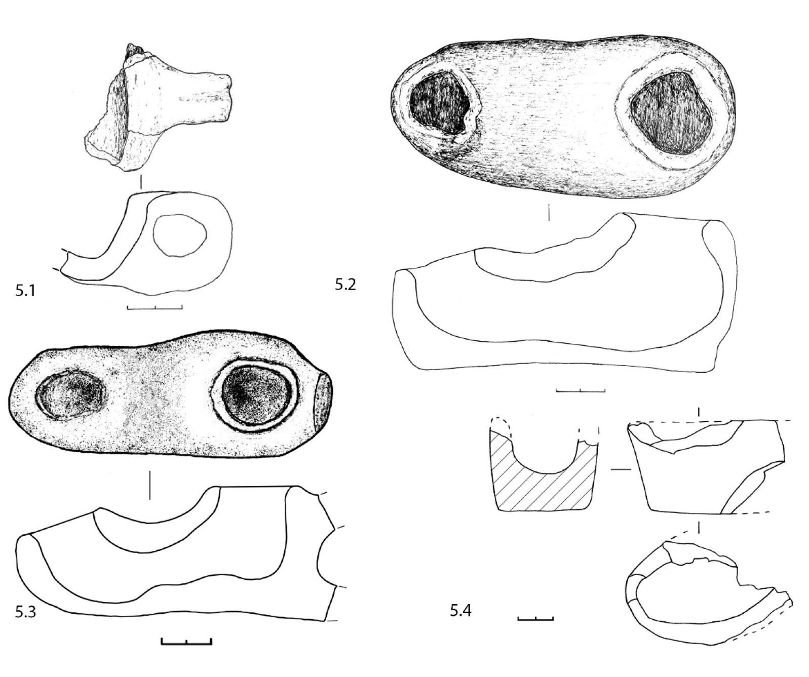 Рис. 5. Лепные светильники 5.1–2 – Нижне-Гниловское городище; 5.3 – Кизитиринское городище; 5.4 – Ростовское городище. Рисунки Белецкой И.В. и Челышевой Е.В.