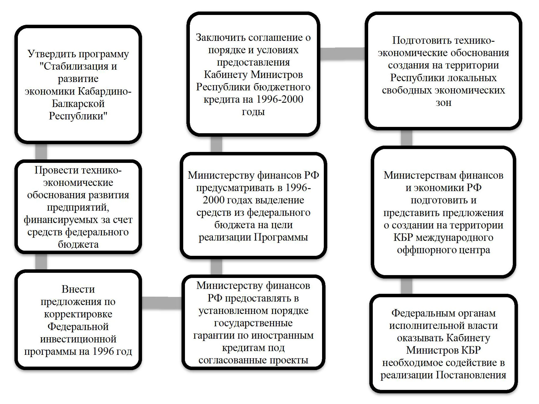 Значимым событием конца 1995 г. можно назвать подписание Постановления Правительства РФ от 18.12.1995 г. № 1244 «О стабилизации и развитии экономики КБР и создании на ее территории свободных экономических зон» [Постановление… 1995], в соответствии с которым планировалось реализовать в КБР ряд мер, направленных в перспективе на положительные трансформации во внешнеэкономическом сотрудничестве (рис. 1).