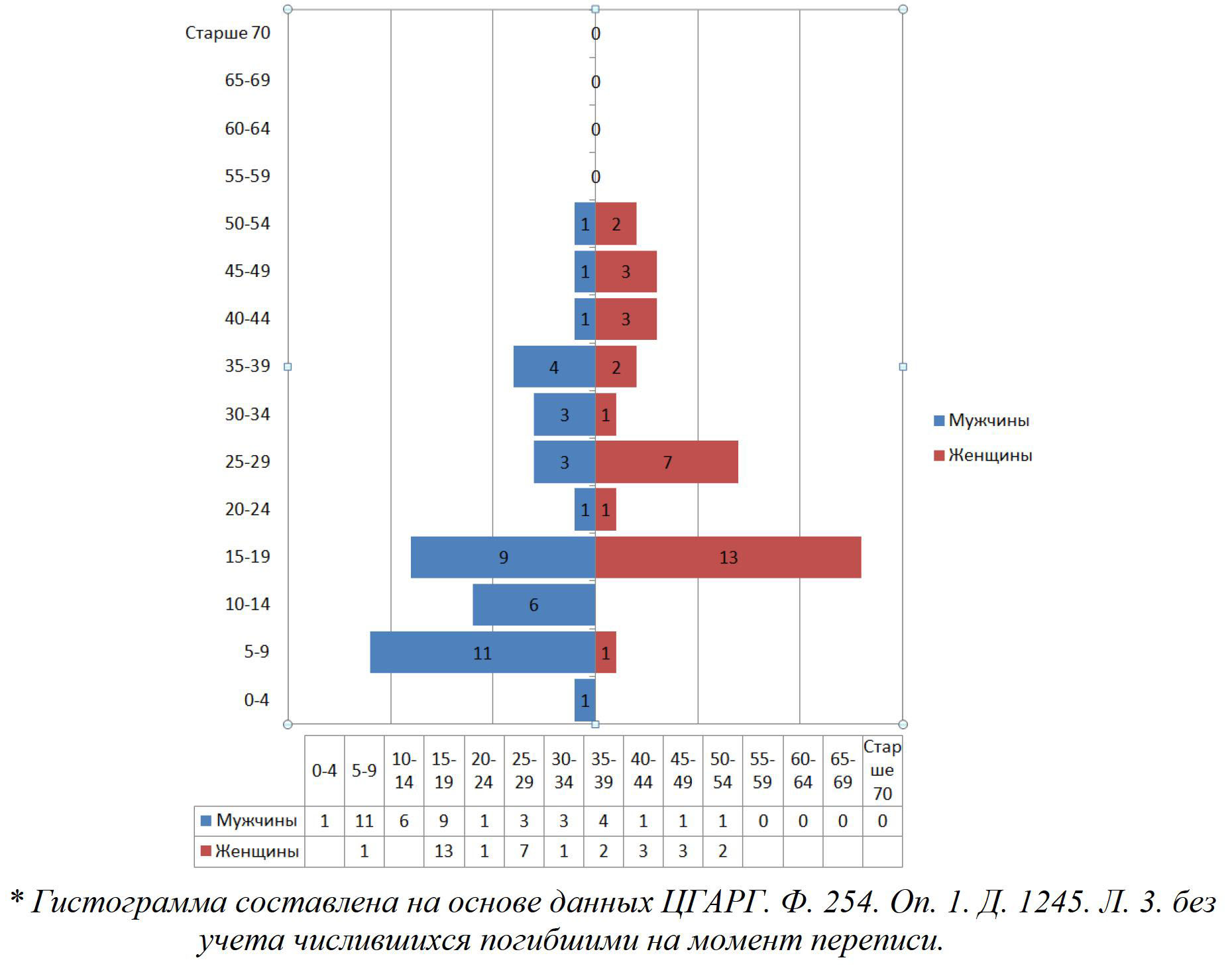 * Гистограмма составлена на основе данных ЦГАРГ. Ф. 254. Оп. 1. Д. 1245. Л. 3. без учета числившихся погибшими на момент переписи.