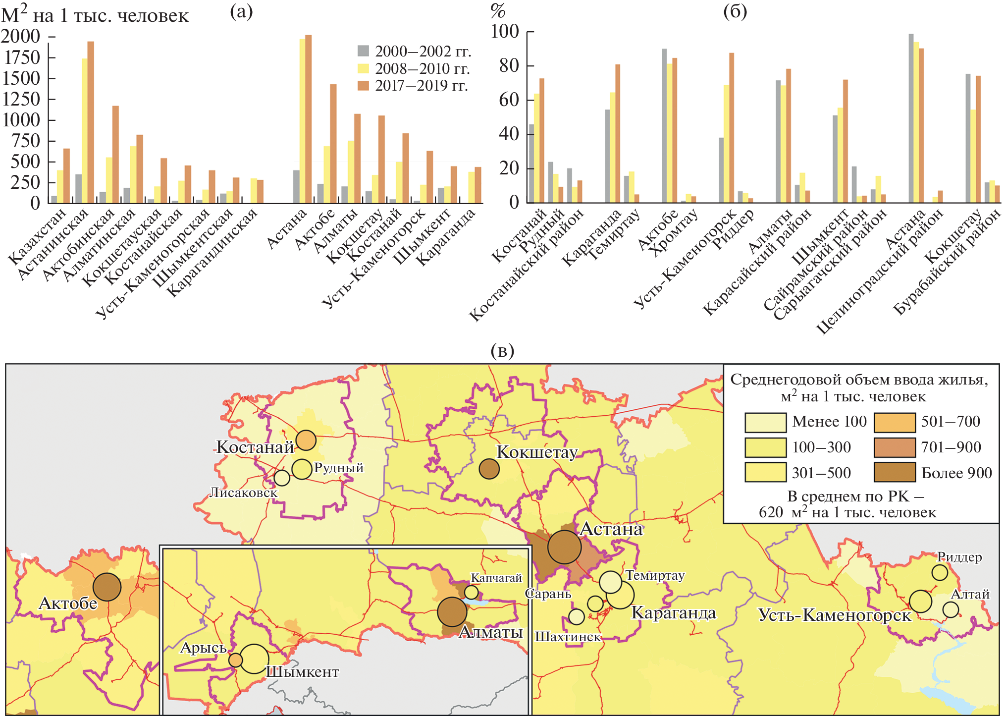 The paper is focused on the recent stage in development of Kazakhstan urban agglomerations, formed as one of the priorities of state policy. Amid the absence of criteria, the boundaries of agglomerations were delimited by 1.5-hour isochrone of transport accessibility around cities with a population of over 100 000. Then, eight centers were selected using a modified coefficient of development, which took into account, in addition to urban satellites, villages with a population of over 3000. At the second stage, the degree of separation between the cores of agglomerations and zones of influence or the rest of the regions was analyzed by means of demographic and socio-economic indicators. The case of Kazakhstan has shown that the inherited structure of economy and low-comfort environment of the centers do not contribute toward the development of most agglomerations. During the post-Soviet period, their share in the population of the country increased from 43 to 52%, but the administrative approach of agglomerations “construction” works only where there are objective prerequisites and an evolutionary backlog. Of the agglomerations whose status is stated in government documents as growth points, the Almaty agglomeration is one of the most developed. The gravity zone of Shymkent includes mainly large villages, some of which have recently become towns. The capital city agglomeration in terms of development is noticeably inferior even to the neighboring Karaganda. Aktobe is able to attract residents only of the north-western regions. According to the dynamics of socio-economic development, both metropolitan agglomerations stand out, which shows the level of wages and the commissioning of housing. The three largest agglomerations are the most tertiarized, while the rest retain high employment in industry, the concentration of which in the cores does not contribute to the development of agglomerations. Except for Almaty, which is surrounded by signs of the starting suburbanization, the core cities are growing faster than their zones of influence. The suburbs lack of places for employment, a weak social infrastructure, and a lower income. This situation, which is typical of the initial stages of development, hinders the use of the classical advantages of agglomerations.