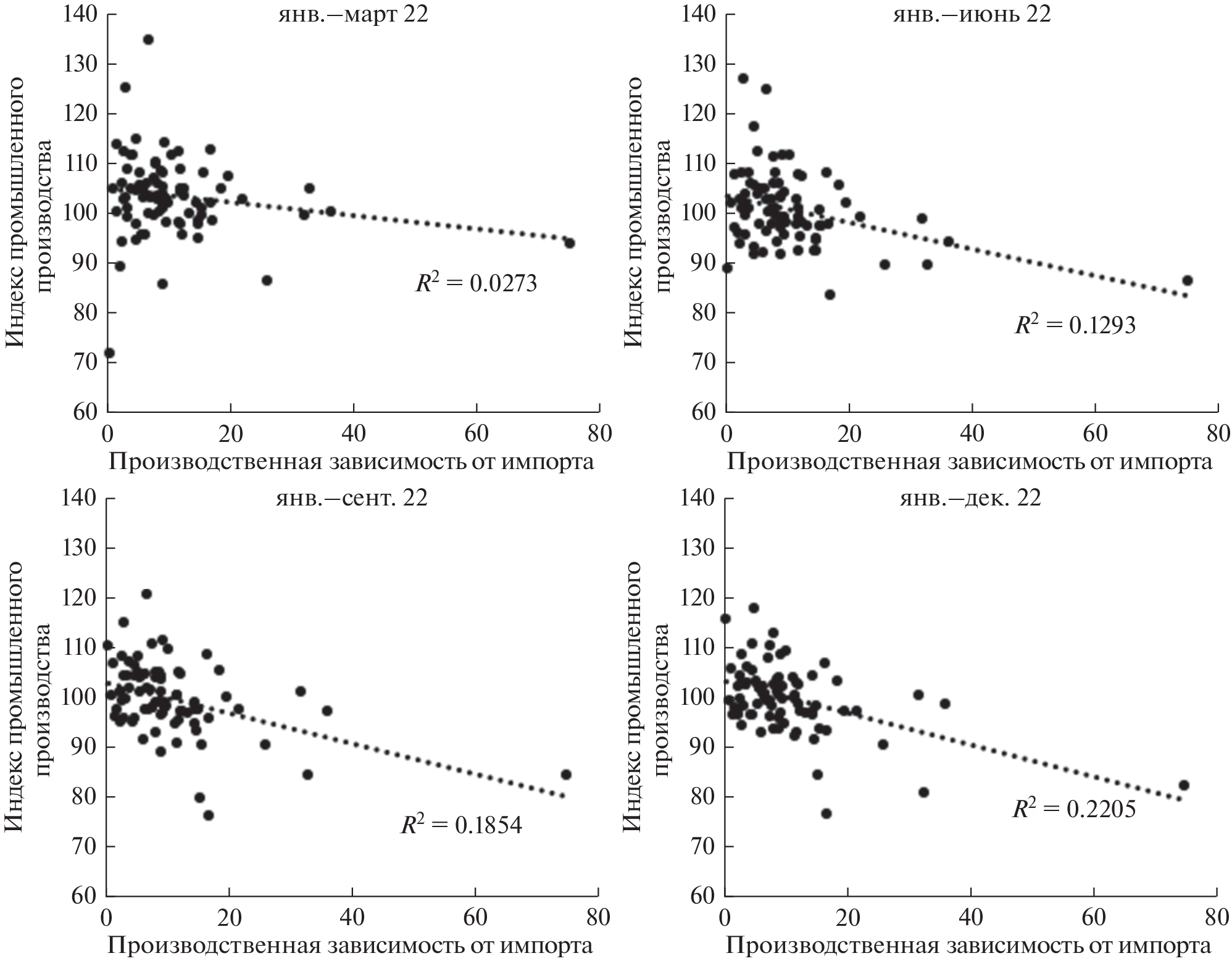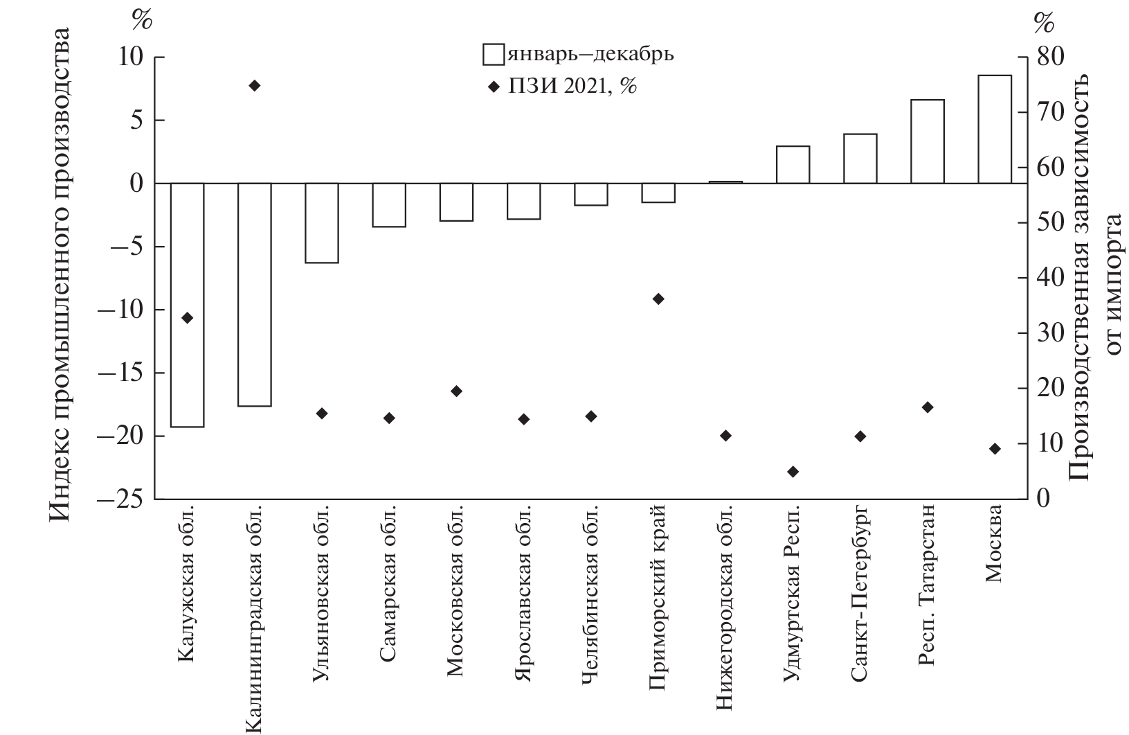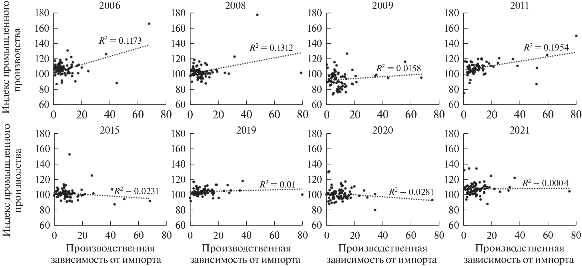 The key factors in the regional consequences of the sanctions imposed in 2022 on certain sectors of the Russian economy were disruption of supply chains and production ties with foreign companies. The significance of these factors for the regional economy can be assessed through the indicator of production dependence on imports. The study revealed that low production dependence on imports is typical for the least developed regions that are poorly integrated into the international trade system, as well as individual regions specializing in the extraction of fuel and energy minerals, for which imports are more important than mass supplies of equipment and components. A high level of dependence is manifested in three types of regions: those specializing in machinery industry, entities on whose territory international ports are located, as well as territories where large investment projects are being implemented with the participation of foreign capital and/or with significant purchases of foreign equipment. Although in 2020–2021, production dependence on imports had practically no effect on the overall dynamics of the industry. In 2022 this factor again became significant and led to a deterioration in the situation in the group of regions with the maximum level of production dependence on imports. The strengthening of the negative impact of production dependence on imports, among other things, was the result of the policy of import substitution carried out in Russia over the past decade, aimed at directly replacing the supply of imported goods to the Russian market, primarily through the localization of the final stages of production. At the same time, the absence of a stimulating policy to increase competitiveness in export sectors through the development of own technologies and the production of technological equipment can lead to technological blocking and a long-term industrial crisis in regions with medium and low production dependence on imports.