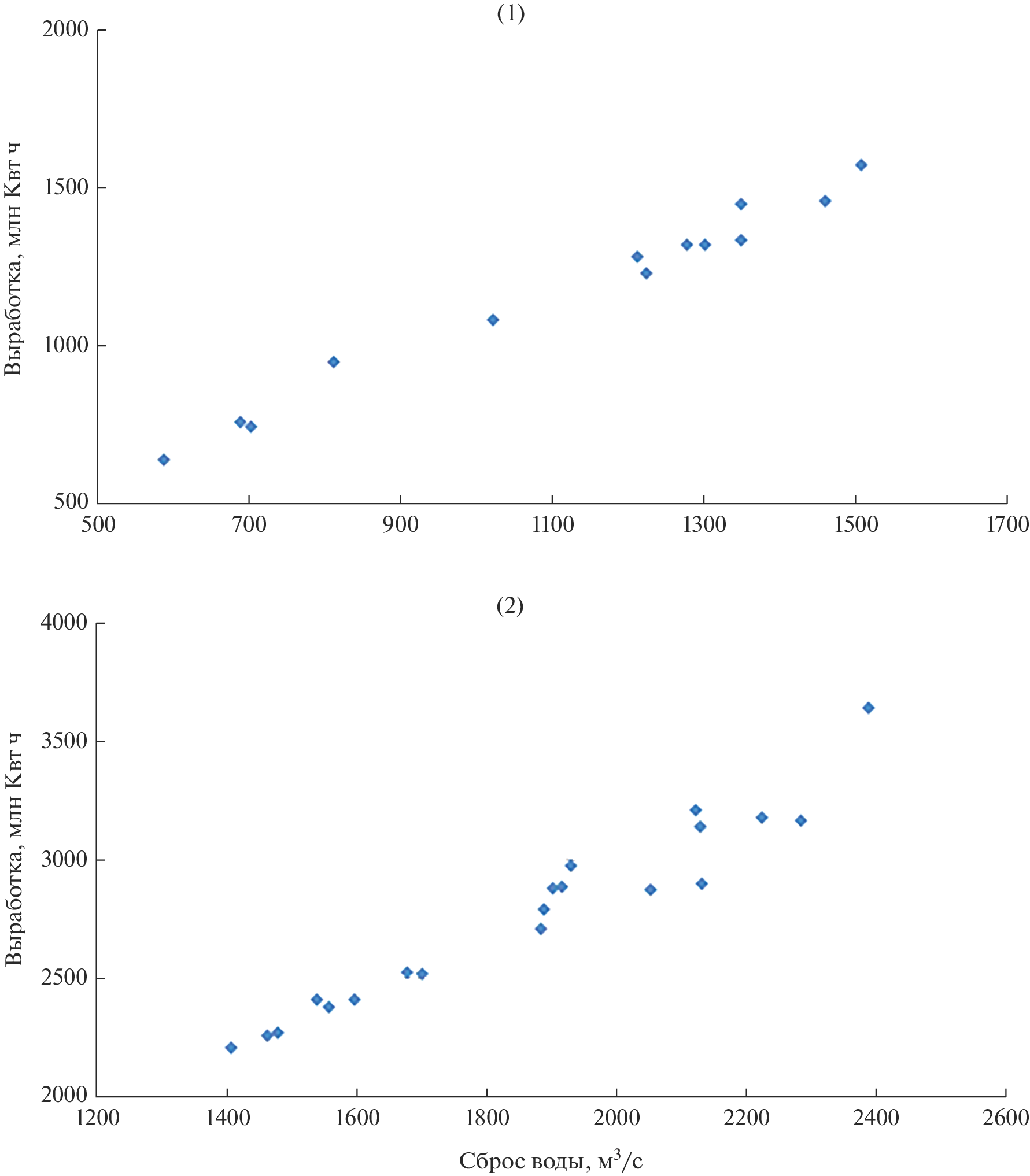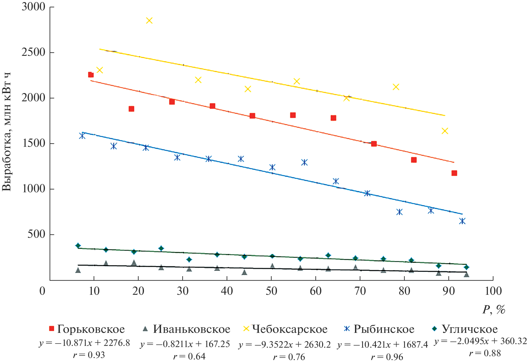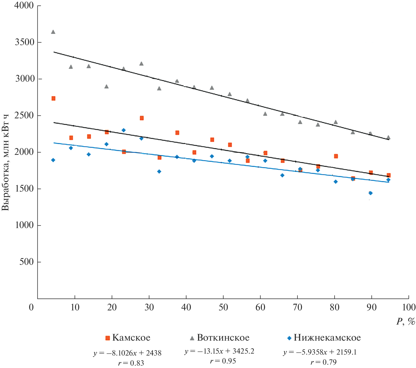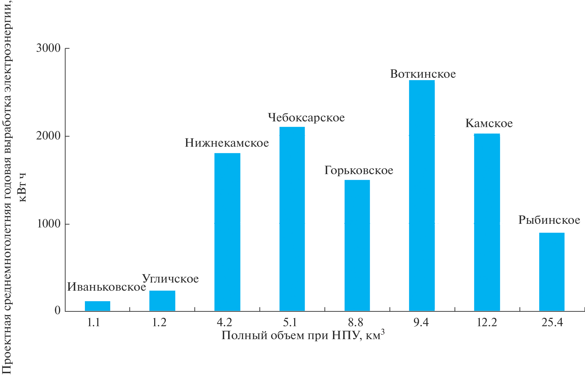 Гидроэнергетика – важный фактор развития экономического развития страны, особенно учитывая, что она обеспечивает пиковые нагрузки в электрической сети, чего не могут сделать тепловые и атомные электростанции. Вместе с тем создание ГЭС и связанных с ними водохранилищ приводит к целому ряду проблем. В основном экологических (затопление больших площадей, нередко занятых ценными сельскохозяйственными угодьями, ущерб рыбному стаду и др.). Поэтому важно знать, насколько эффективно работают гидроэлектростанции. Попытка решить такую задачу предпринята в данной статье на примере Верхневолжского и Камского каскадов водохранилищ. Представлены основные сведения о них – площади зеркала, полном и полезном объемах, средней проектной выработке электроэнергии. Оценен вклад рассмотренных каскадов в выработку электроэнергии всего Волжско-Камского каскада водохранилищ. Сформированы ряды данных о годовом притоке, сбросе воды через гидроузлы и выработке на них электроэнергии с 2002 по 2021 г., по ряду станций с 2004 по 2022 г. Показана связь площади водохранилищ с их объемом, а также выработки электроэнергии с водностью отдельных лет и периодов. Установлена связь притока воды в водохранилища с ее сбросом через турбины ГЭС. Особое внимание уделено Рыбинскому водохранилищу, осуществляющему многолетнее регулирование стока. Рассчитана выработка электроэнергии в многоводные, средние по водности и маловодные годы. Оценено отклонение фактической выработки электроэнергии от средней проектной, на основании чего сделан вывод об эффективности работы ГЭС. Определена вероятность выработки электроэнергии в зависимости от прогнозных значений речного стока.