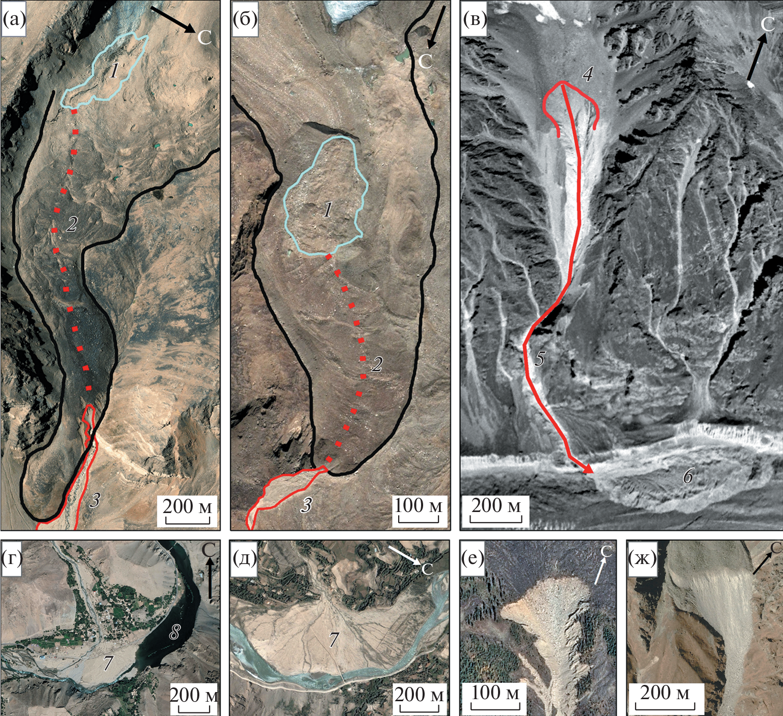 На основе анализа материалов дистанционного зондирования Земли и публикаций приводятся данные о катастрофических проявлениях опасных природных процессов, связанных с деградацией ледников и горной мерзлоты, вызванной изменением климата. На фоне ускоренных темпов деградации ледников чаще наблюдаются катастрофические проявления их динамики – сходы ледников и ледяные лавины, ледово-каменные лавины. На Центральном и Западном Кавказе наблюдается активизация сходов каменных и ледово-каменных лавин, максимальные из которых были с дальностью выброса до 11.3 км (на г. Казбек в 2014 г.), с площадью зоны поражения 3.2 км2 (в ущелье Аксаут в 2022 г.). В 2021–2022 гг. происходили катастрофические сходы ледников и ледово-каменные лавины на г. Мармолада в Альпах, в ущелье Джууку на Тянь-Шане и в долине р. Ронти Гад в Гималаях. Максимальным по объему был сход ледника Седонгпу в Восточном Тибете в 2018 г. (130 млн м3). Таяние льда в массивах горной мерзлоты (моренных пьедесталах) приводит к формированию селей гигантских объемов выноса, достигающих 300 млн м3 и более. С блокировкой подземных каналов стока внутри каменных глетчеров связаны накопления воды в длительное время пустующих котловинах и формирование озер с последующими их катастрофическими прорывами. Процессы, происходящие в ледниках и моренных комплексах, часто имеют унаследованный и взаимообусловленный характер и длительный период подготовки, что позволяет на основе постоянного мониторинга с использованием космоснимков выявлять прогностические признаки и предупреждать заранее о грозящей опасности.