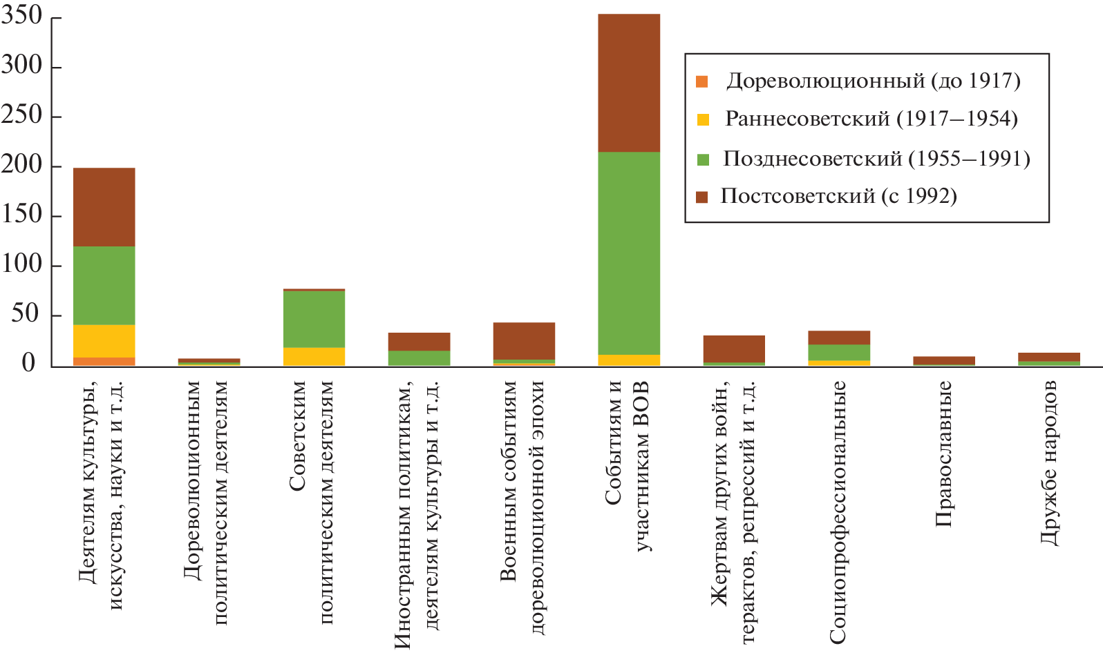 The urban environment of Moscow is considered through the concept of the political landscape as a complex of environment-shaping, representative objects. The image of the capital is not only the political history of the state, captured in buildings and monuments, but also a mirror of the representations of the national elite about its social support, development prospects, the outside world, and diverse social ideas about space. Official buildings as the focus of the political and administrative functions of the capital and city monuments are shown in the study as the dominant categories of place, a matrix of new representations that determine the evolution of the urban political and symbolic landscape. The objective of the study is to trace the stages of evolution of the most important material elements of the Moscow political landscape: the location, the construction time, the origin, and other features of the buildings of state institutions and monuments. The features of the modern spatial distribution of government buildings and monuments are studied. The historical hyperconcentration of government buildings in the capital center has been confirmed. Two large areas of high concentration of government buildings are identified: around Lubyanka, Kitai-Gorod, Staraya and Novaya squares and within the Moscow City business complex, as well as the relationship between the significance of a government agency and proximity to the Presidential Administration and the Kremlin as the main centers of decision-making. Despite the transfer of several federal agencies outside the center, there has not yet been a noticeable spatial decentralization of the administrative functions of the capital. In turn, the geography of the monuments repeats the general patterns of the capital plan. Their location reveals the radial-ring and sectoral structures of the city, as well as the specialization of districts. The absolute dominants of the landscape are the monuments dedicated to the heroes and events of the Great Patriotic War (more than 40% of the total number of monuments), which is one of the basics of modern Russian identity. The importance and significance of many capital monuments as an element of the political landscape is based on a strong long-term discourse. Despite some changes (the installation of monuments to rehabilitated public and political figures, victims of new wars and terrorist acts, as well as orthodox monuments), the monumental landscape of the capital is quite stable.