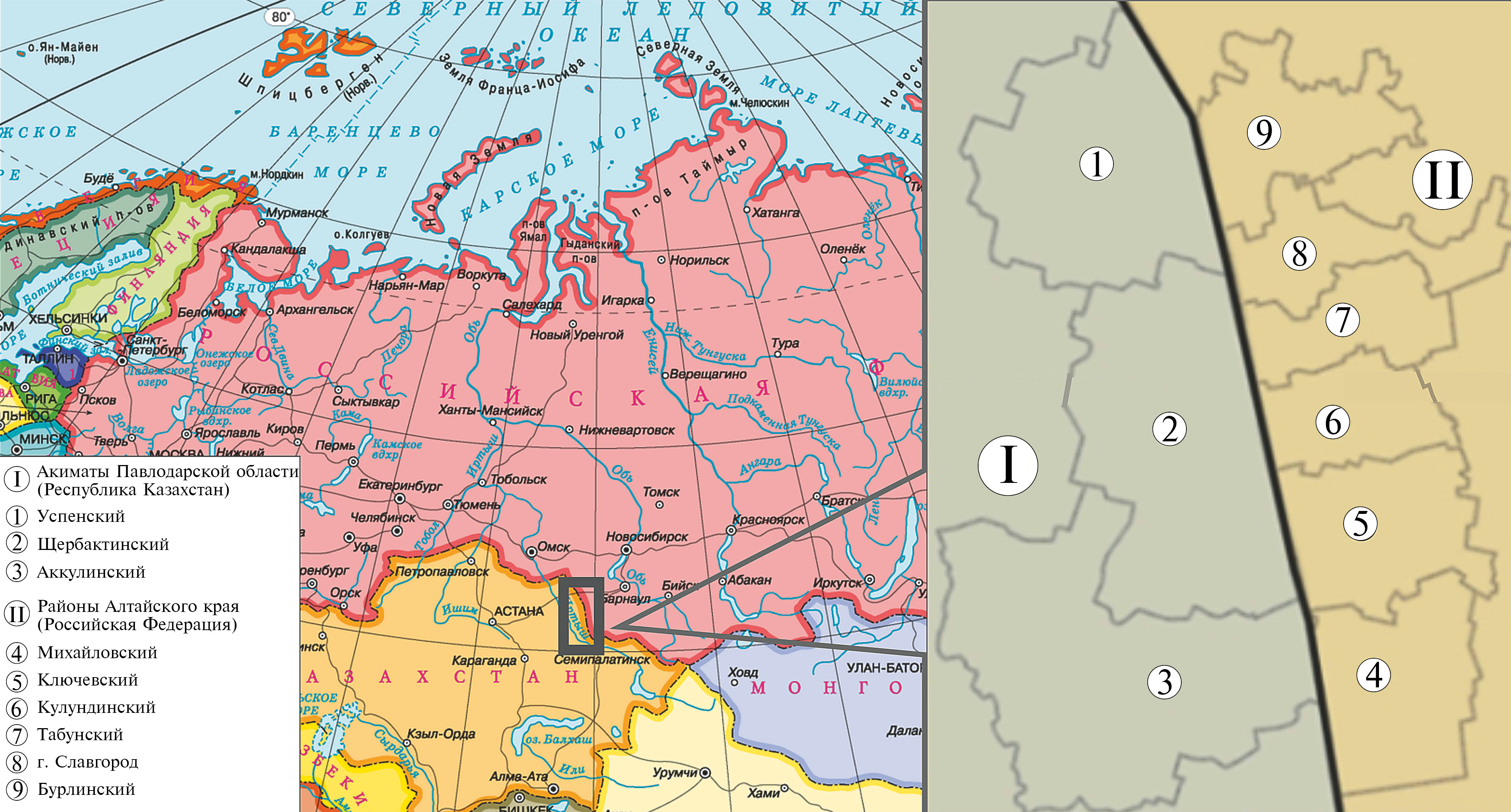 Рассмотрены муниципальные районы двух приграничных регионов: Алтайского края (АК) России и Павлодарской области (ПО) Республики Казахстан (рис. 1).