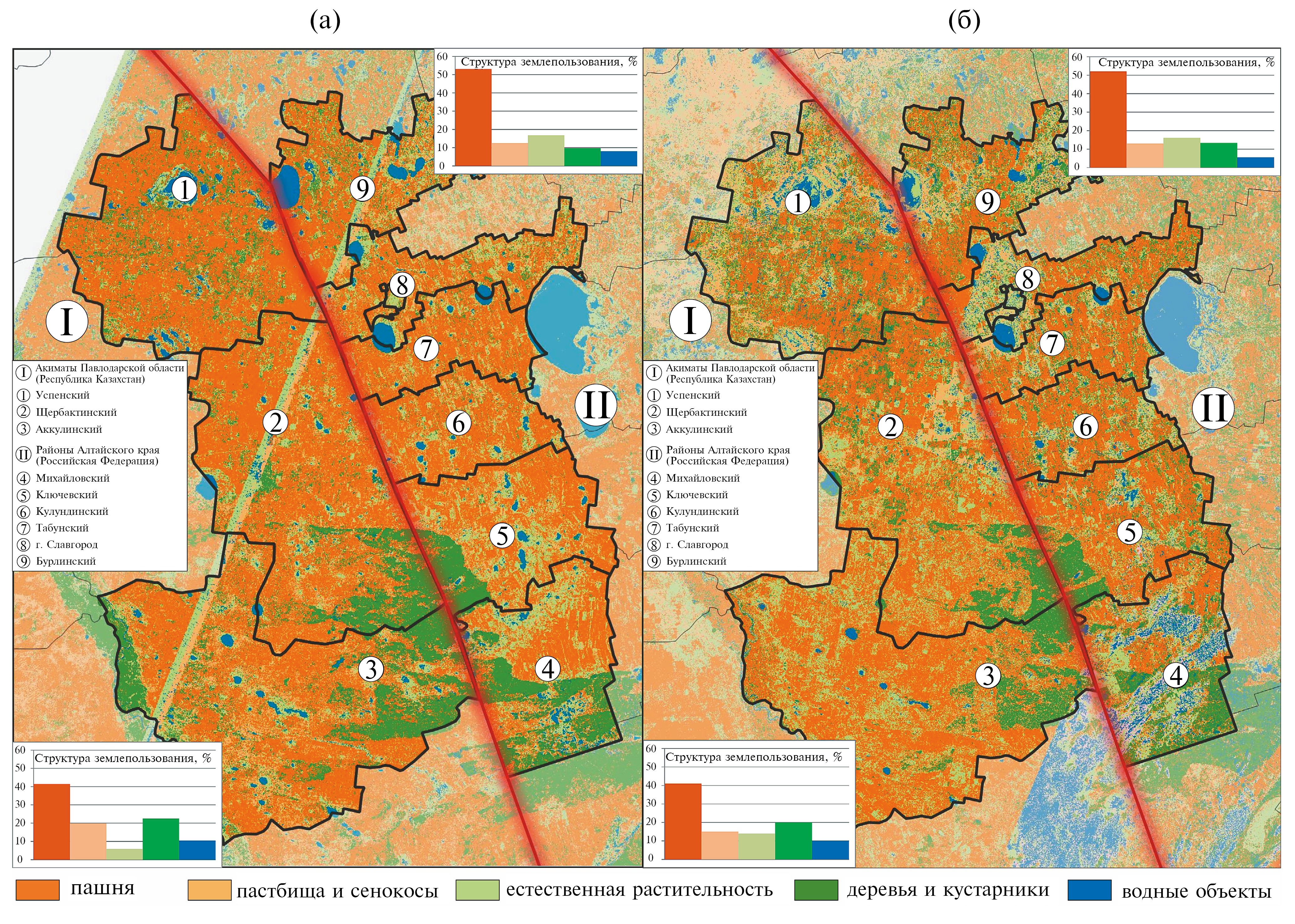 Результаты классификации и генерализации данных спутников серии Landsat (рис. 3) показали асимметричность развития Кулунды по разные стороны государственной границы: высокая распаханность российской части при высокой доле естественных пастбищ, сенокосов и залежей, занятых степной растительностью в Казахстане.