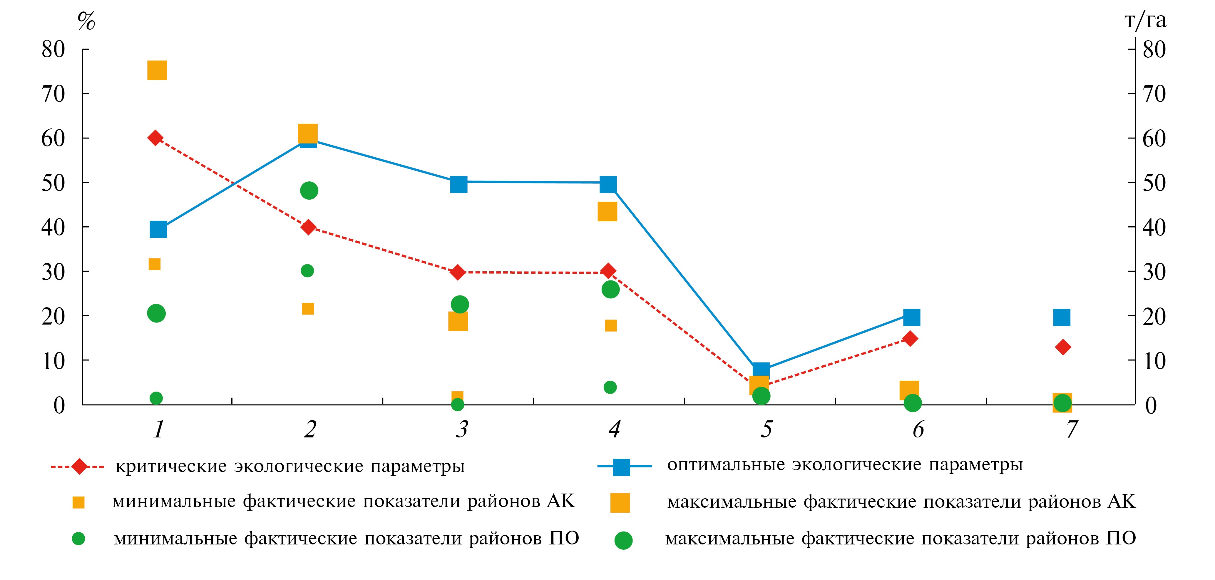Экологическое нормирование и определение экологических ограничений использования агроландшафтов основано на оценке допустимых и критических нагрузок на окружающую среду (таких, как нагрузка скота на пастбищные угодья, загрязненность почв минеральными удобрениями, степень распаханности, лесистости, сельскохозяйственной преобразованности территории и т.д.). Под допустимой понимают такую нагрузку, при которой отклонение от нормального состояния системы не превышает естественных изменений и не ведет к ухудшению качества среды (Израэль, 1984). Для оптимизации структуры землепользования разрабатываются предложения экологоприемлемого соотношения площади средообразующих и антропогенно преобразованных экосистем, которое будет способствовать сохранению экологического баланса (Одум, 1986). Для изучаемой территории использованы оптимальные параметры структуры земельных угодий (Одум, 1986; Реймерс, 1994) с учетом региональной специфики степной зоны (Орлова, 2014; Парамонов, Симоненко, 2007) (табл. 2).