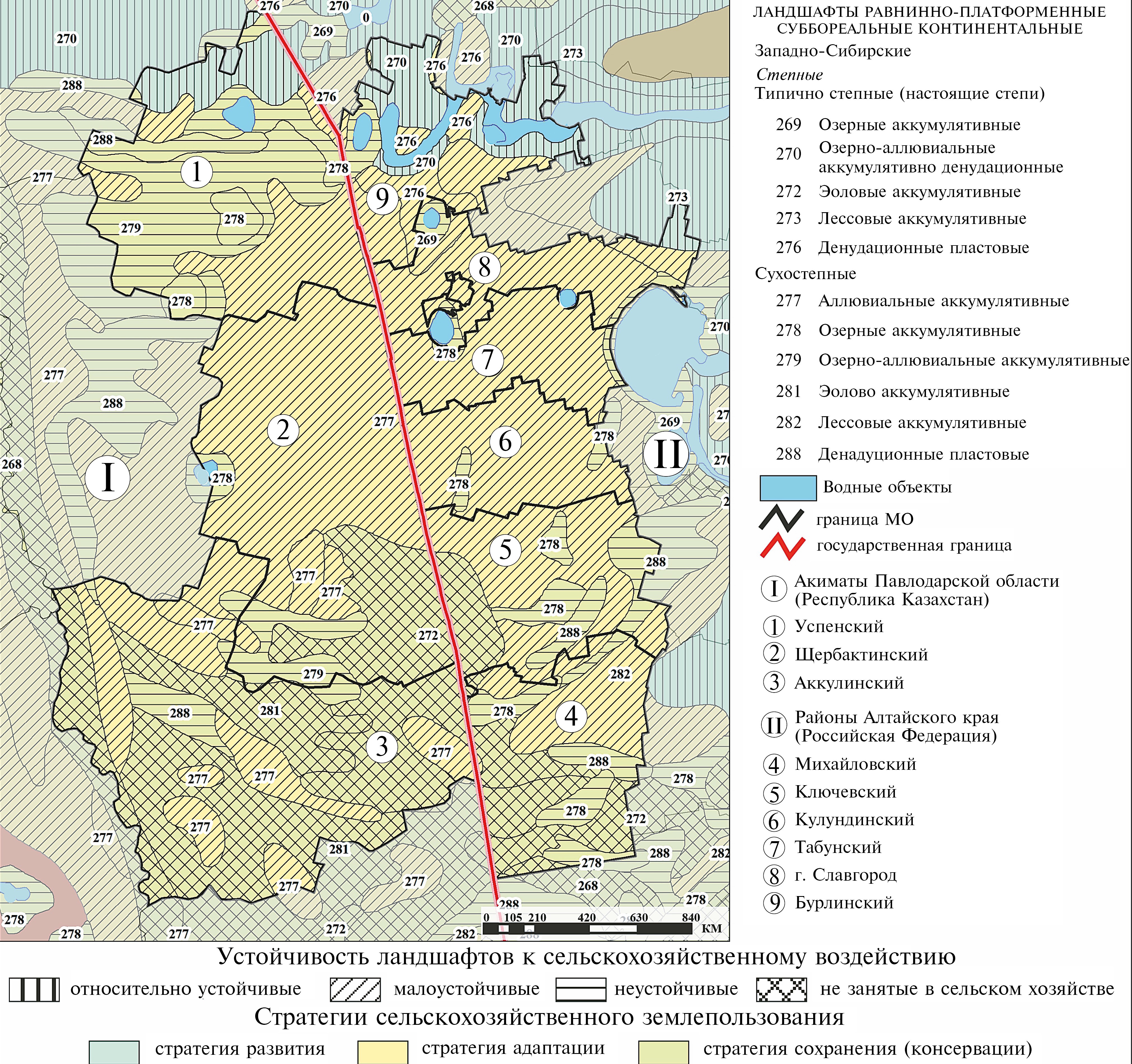 В поисках баланса между необходимостью развития аграрного производства и сохранения природных комплексов уязвимых засушливых земель в трансграничном регионе действенным механизмом может стать использование эколого-ландшафтных подходов в стратегическом планировании сельскохозяйственного землепользования. Рассмотрение трансграничной территории как единой геосистемы и дифференциация сельскохозяйственного воздействия на отдельные ландшафты с учетом их устойчивости позволит остановить или предотвратить процессы их деградации, поскольку развитие сельского хозяйства в рамках экологоприемлемых ограничений позволит соблюдать определенный баланс между развитием и сохранением. Реализация предложенного подхода на примере сухостепных ландшафтов Российско-Казахстанского приграничья позволила получить следующие результаты.