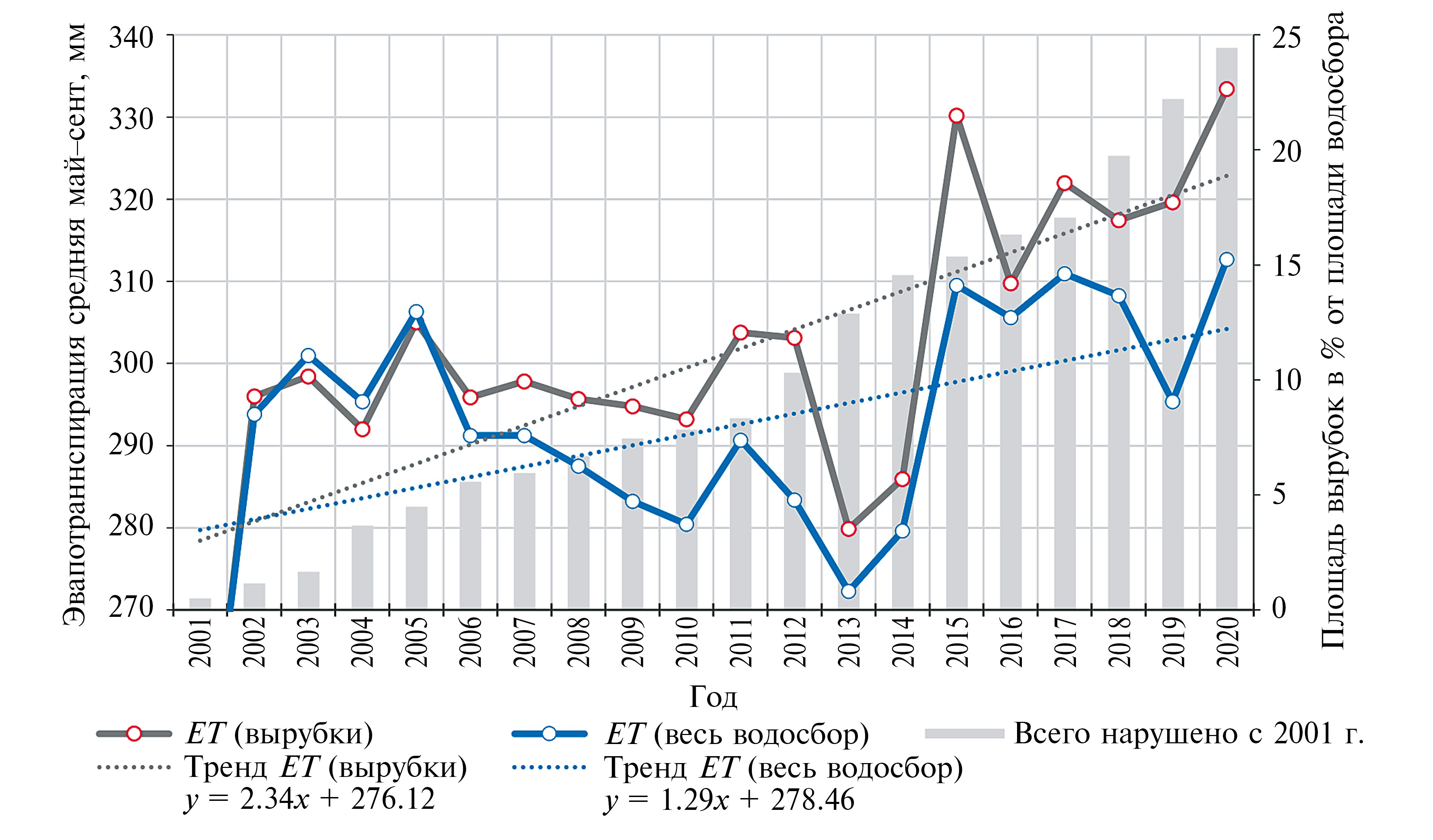 Согласно данным рис. 3 на временном отрезке 2001–2020 гг. эвапотранспирация на вырубленных участках и на водосборе в целом имеет тенденцию к увеличению. На водосборе суммарное испарение увеличилось на 22 мм, что можно объяснить устойчивым годовым приростом среднегодовой температуры воздуха для этого региона (Корец и др., 2020). Но более интенсивный прирост эвапотранспирации на вырубленных участках (40 мм за 20 лет) при тех же климатических условиях, скорее всего, связан с особенностями лесовосстановления, т.е. с ростом суммарного испарения на сукцессионных стадиях.
