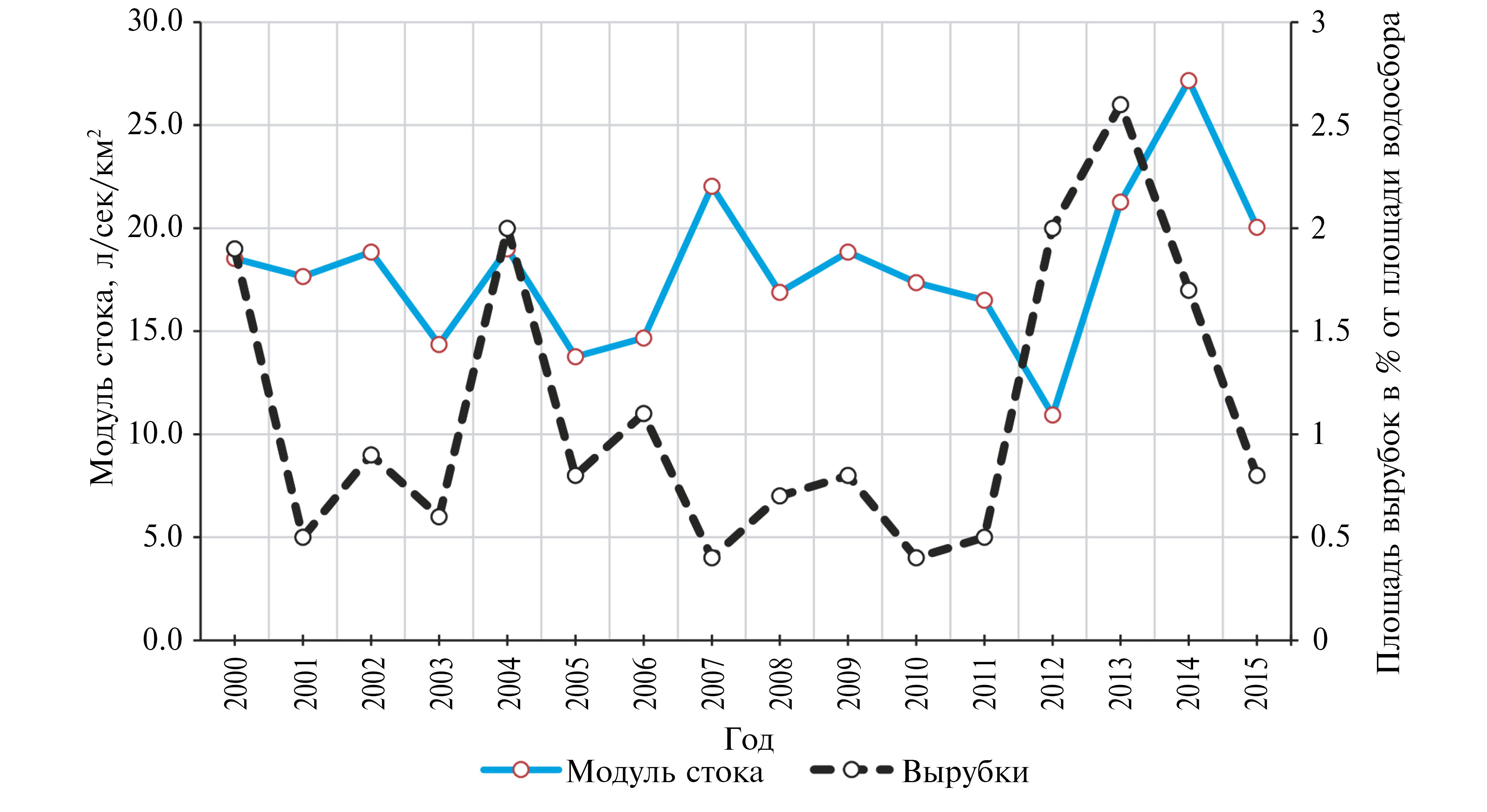 Анализ динамики стока р. Сухой Пит с учетом изменения площадей свежих вырубок показал, что наиболее значительные пики подъема воды в реке приурочены не к годам проведения наиболее масштабных рубок, а являются результатом, когда 2–3 года подряд вырубаются значительные площади (2004–2006 гг.), т.е. на увеличении стока отражается аккумулирующий эффект нарушенности земель на водосборе (рис. 5). Резкий скачок модуля стока с 2012–2014 гг. связан как с аномальными погодными условиями (в 2010–2011 и 2013 гг. выпало на 50% больше нормы осадков, а в 2014 г. почти в два раза больше среднемноголетней величины), так и с тем, что в 2012–2013 гг. ежегодно вырубалось более 2% от площади водосбора.