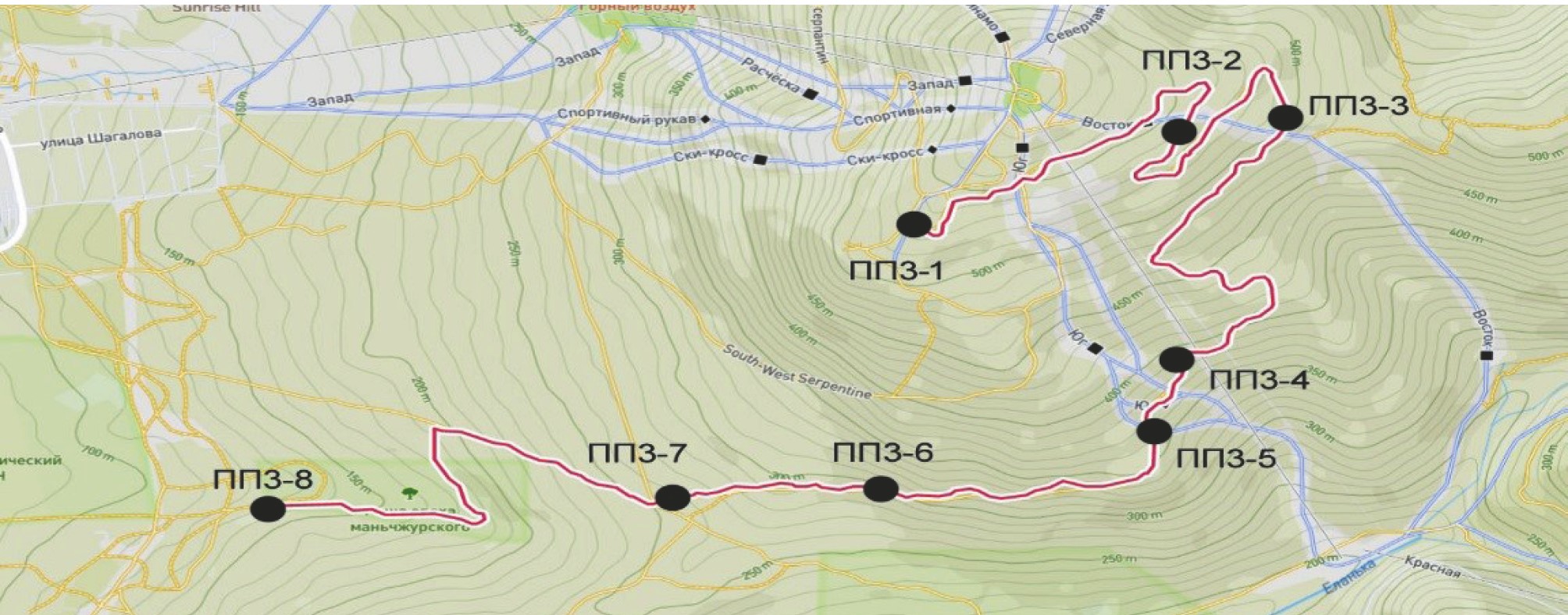 ПП3-8 | Конец тропы, нижний стенд, район биатлонного комплекса | 46°56ʹ35ʺ | 142°46ʹ13ʺ | 134 |