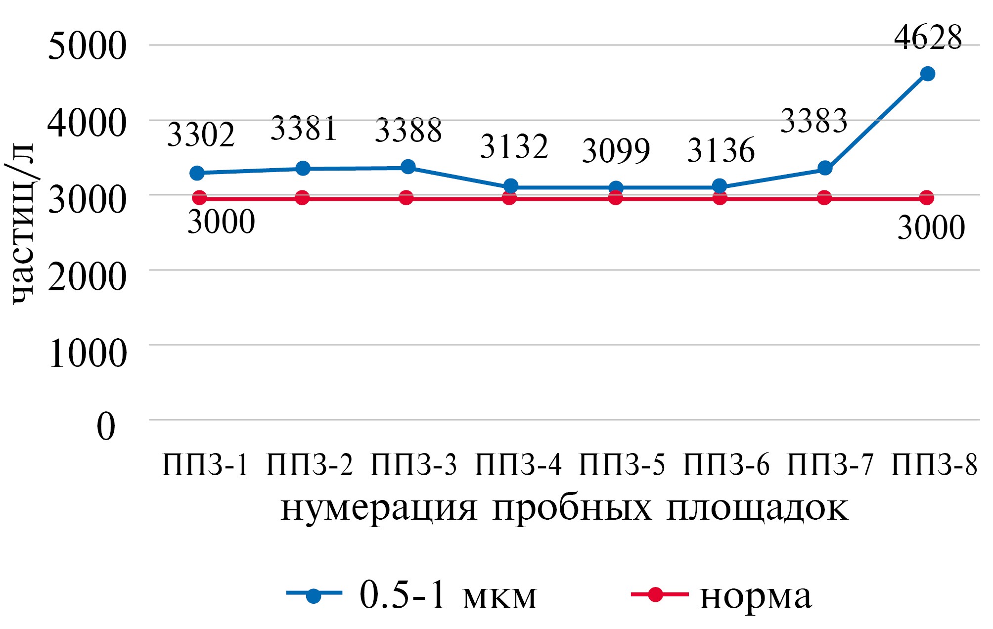 Общие значения суммы аэрозольных частиц (в диапазоне 0–10 мкм) в приземной атмосфере соответствовали фоновым значениям чистой природной среды (∑44905–∑58884 ч-ц/л) с незначительными понижениями на смотровых площадках ПП3-3 (45647 ч-ц/л) и ПП3-5 (49905 ч-ц/л) и небольшими повышениями – на входе/выходе на терренкур на верхней (ПП3-1) и нижней (ПП3-8) станциях маршрута (∑52424 ч-ц/л и ∑58884 ч-ц/л).