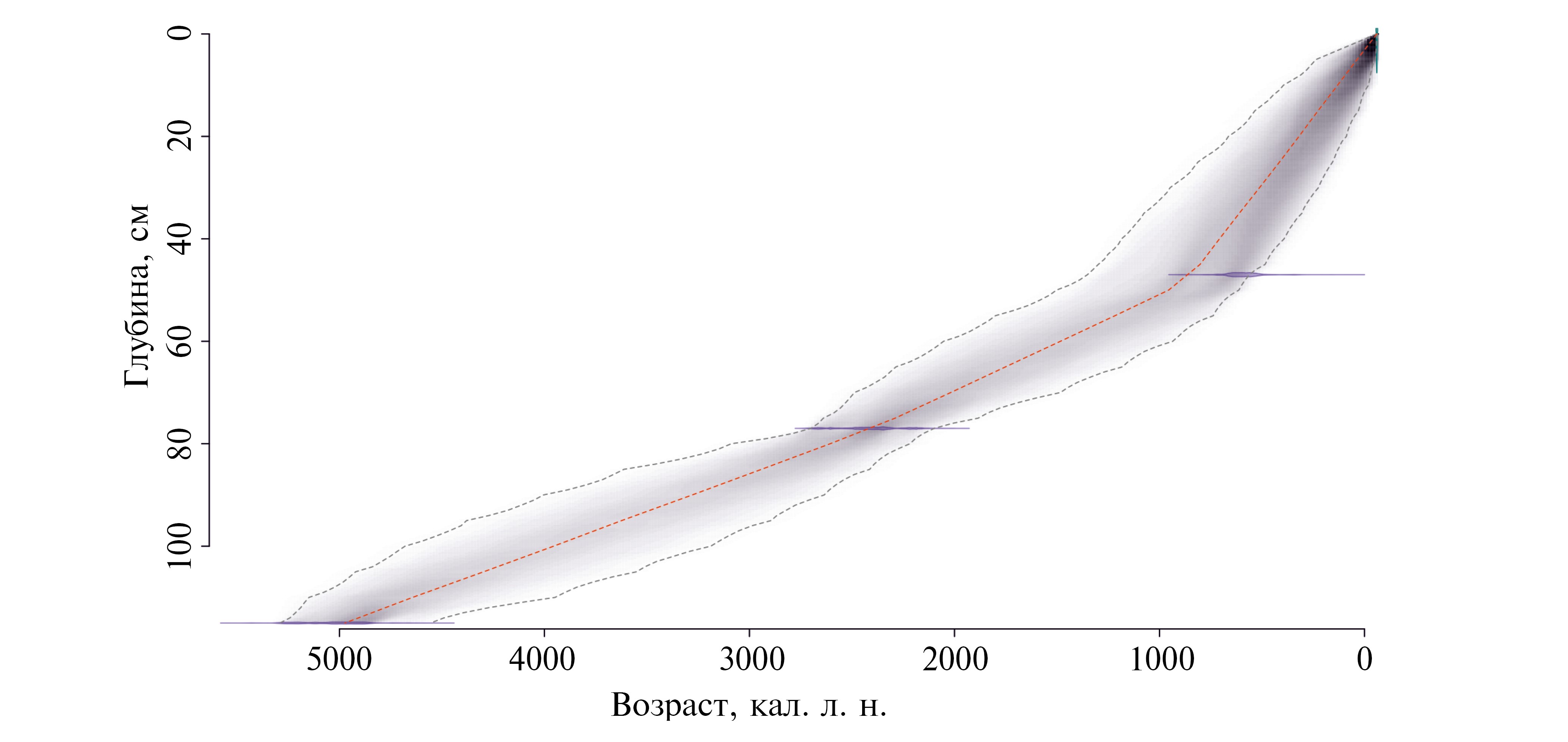 Палеоэкологические исследования Подкосьмовского болота проходили в два этапа. На первом этапе в 2009 г. в наиболее глубокой части болота была пробурена скважина, глубиной 120 см, и выполнены ботанический анализ торфа, спорово-пыльцевой анализ и радиоуглеродное датирование образцов торфа, результаты которых подробно опубликованы (Новенко, 2017; Novenko and Volkova, 2015). При бурении болота установлено, что ниже горизонтов торфа залегает глина, голубовато-серая, тонкослоистая. В составе залежи представлены только низинные виды торфа (рис. 2), в разных частях болота состав залежи отличается незначительно. Торфяная залежь образована осоковым, травяным, древесным (ива пепельная), древесно-травяным и древесно-осоковым торфом (Волкова, 2011). Высокая степень разложения торфа (от 65% в придонных горизонтах залежи до 35–40% – в ее верхней части) указывает на изменчивый гидрологический режим болота, что обуславливало активное разложение растительных остатков в условиях оптимальной аэрации. Возраст базального горизонта торфа – 5040 ± 80 кал. л. н. (калиброванных лет назад). По полученным ранее радиоуглеродным датировкам (табл. 1) (Novenko and Volkova, 2015) в представленной работе рассчитана модель вертикального прироста торфа (рис. 3) с использованием программы Bacon (Blaauw and Christen, 2011) в программной среде R (R Core Team, 2021). Для калибровки радиоуглеродных датировок применена программа Calib 8.2, использующая калибровочную кривую IntCal20 (Reimer et al., 2020).