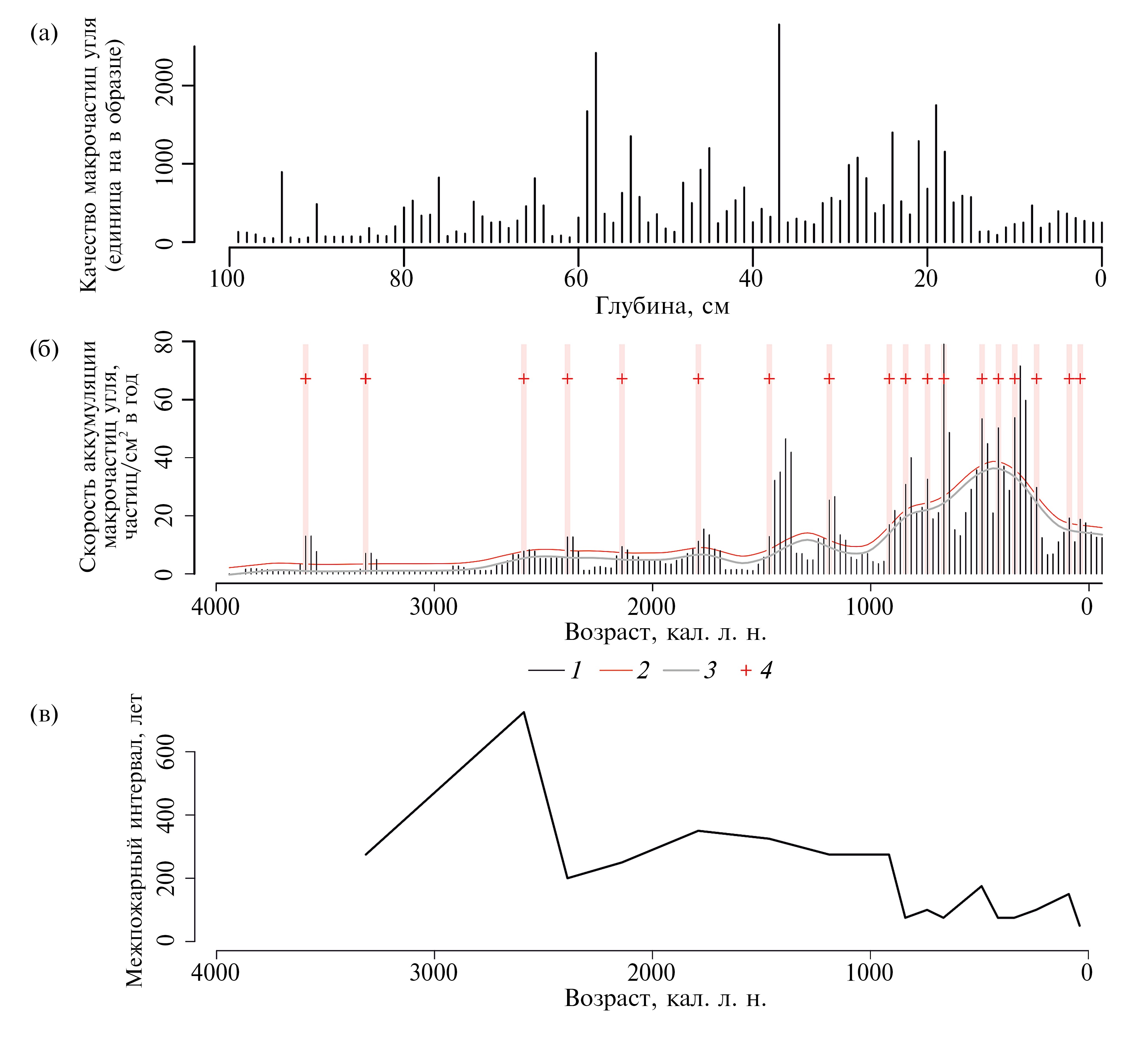Расчеты скорости аккумуляции частиц угля и выделение пиков выявили низкую пожарную активность в период 4000–1500 кал. л. н. (см. рис. 4) Фоновые и интерполированные значения не превышают 10–15 частиц/см2 в год, МПИ колебался от 200 до 350 лет (см. рис. 4в). В период 1500–900 кал. л. н. скорости аккумуляции угля возросли до 20 частиц/см2 в год, однако МПИ оставался длительным и составлял около 150 лет. Резкое увеличение скорости накопления макрочастиц угля в торфе выявлено в интервале 900–300 кал. л. н. Фоновые и интерполированные значения возросли до 30–40 частиц/см2 в год, выделены резкие пики, превышающие 70–80 частиц/см2 в год. МПИ сократился до 50–100 лет. В течение последних 300 лет накопление угля сократилось, выявлен только один пожарный эпизод.